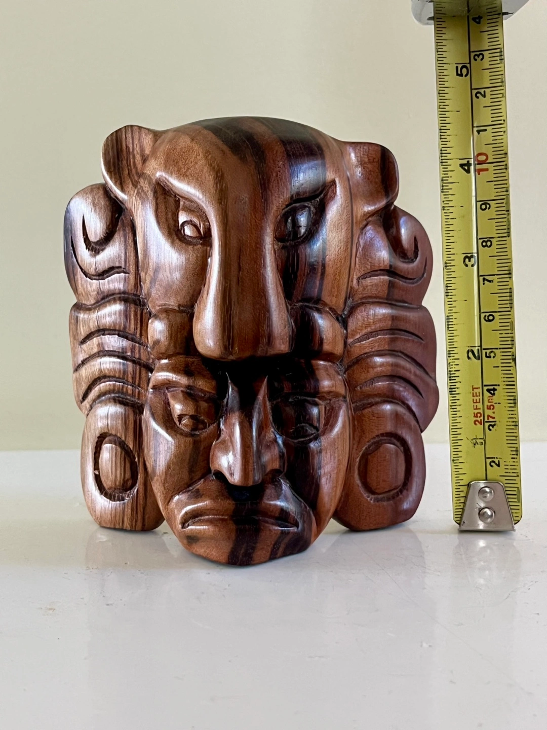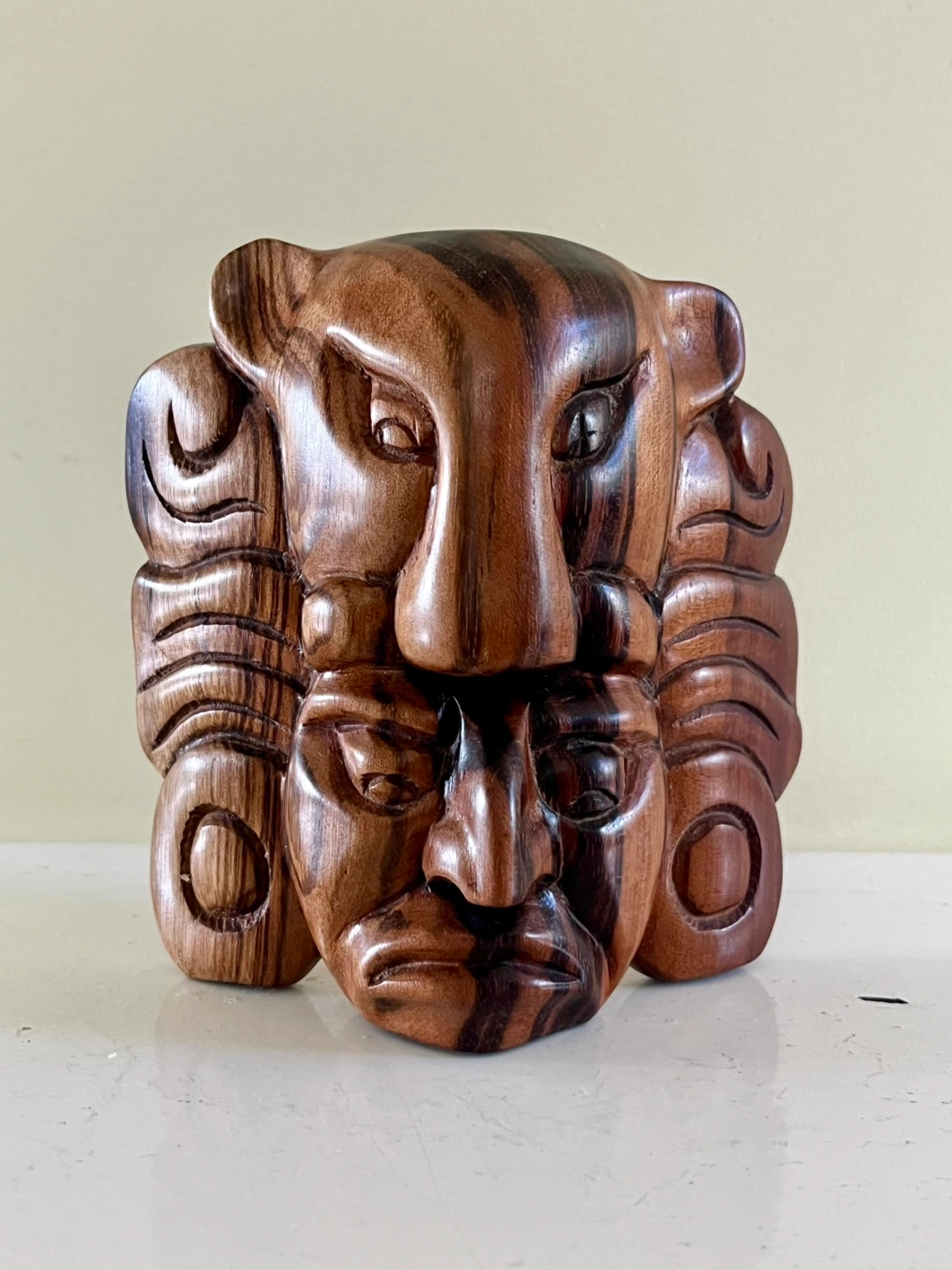 This hand-carved hardwood totem features intricate details of a jaguar and a human face, standing approximately 5 inches tall. Pick up Montgomery. Cross-posted.