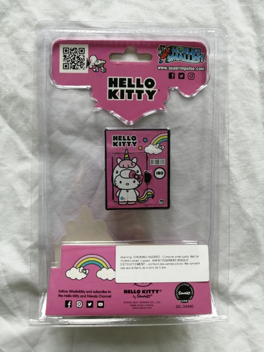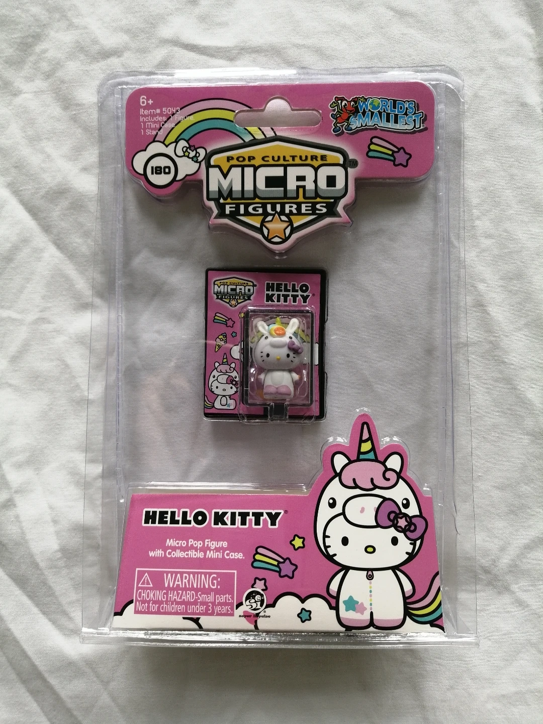 Collectible Hello Kitty micro figure. Part of the World's Smallest Pop Culture Micro Figures series. Features Hello Kitty dressed as a unicorn. Comes in a collectible mini case. Suitable for ages 6+
