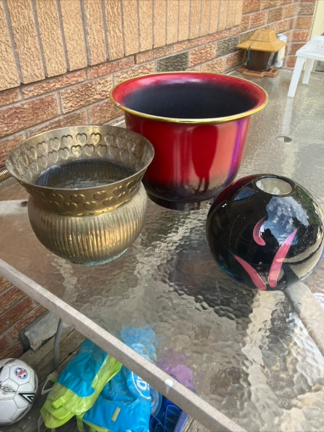 Set of three decorative planters. Brass planter features heart details. Red planter has gold trim. Black planter is spherical with pink accents. Varying sizes-check pictures.Great for indoor or outdoor use. $1.50each or $4for all Cash only, p/up Yonge St & Elgin St-Thornhill
