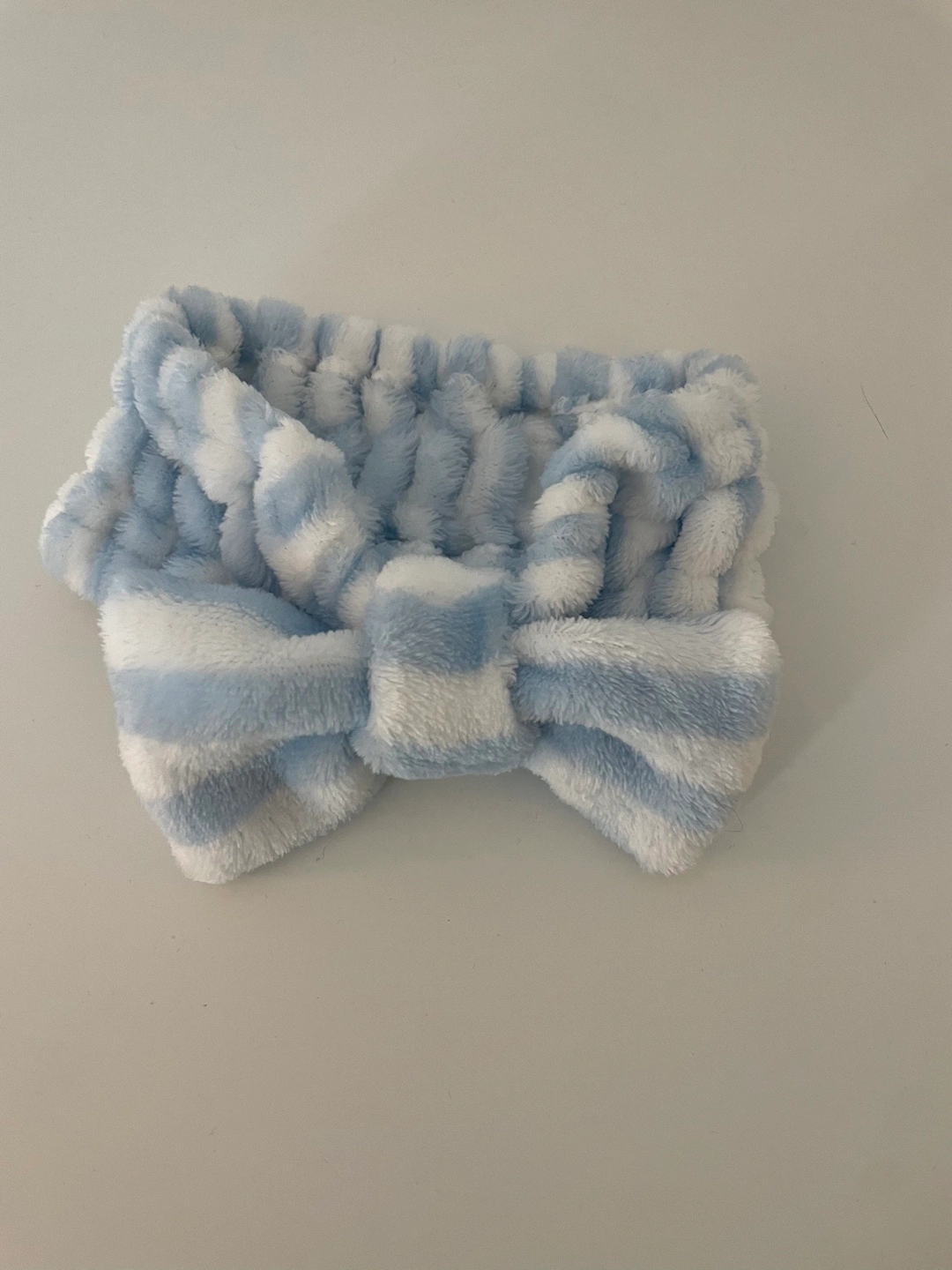 Soft, fuzzy headband. Features blue and white stripes. Bow design. Perfect for washing your face.