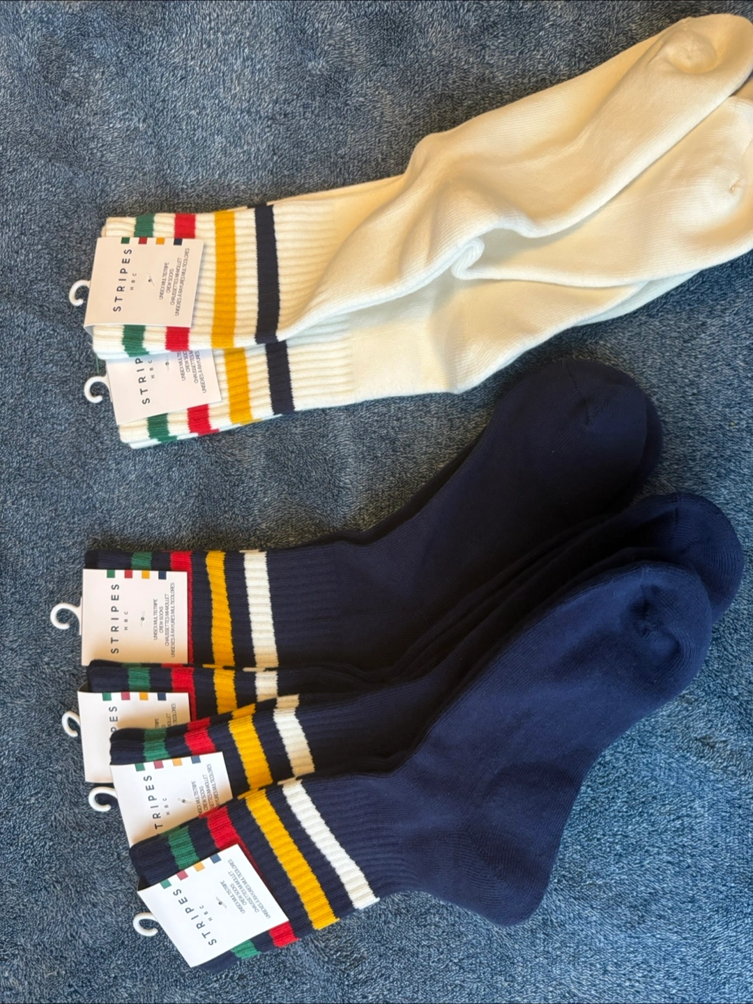 Brand new Unisex Hudson Bay striped socks, 3 more pair’s available 20 each. White pair is L/XL and 2 blue pairs are S/M