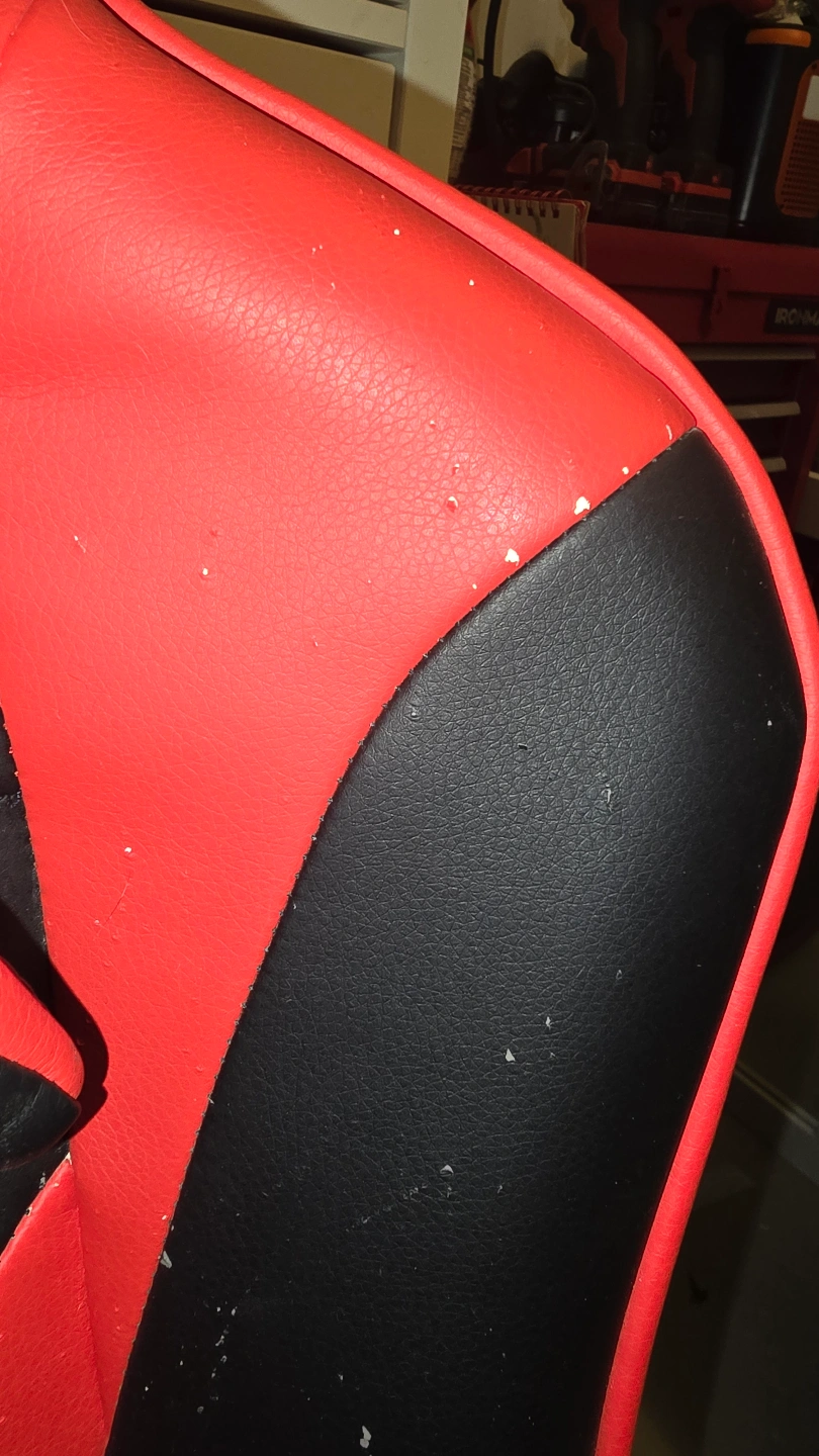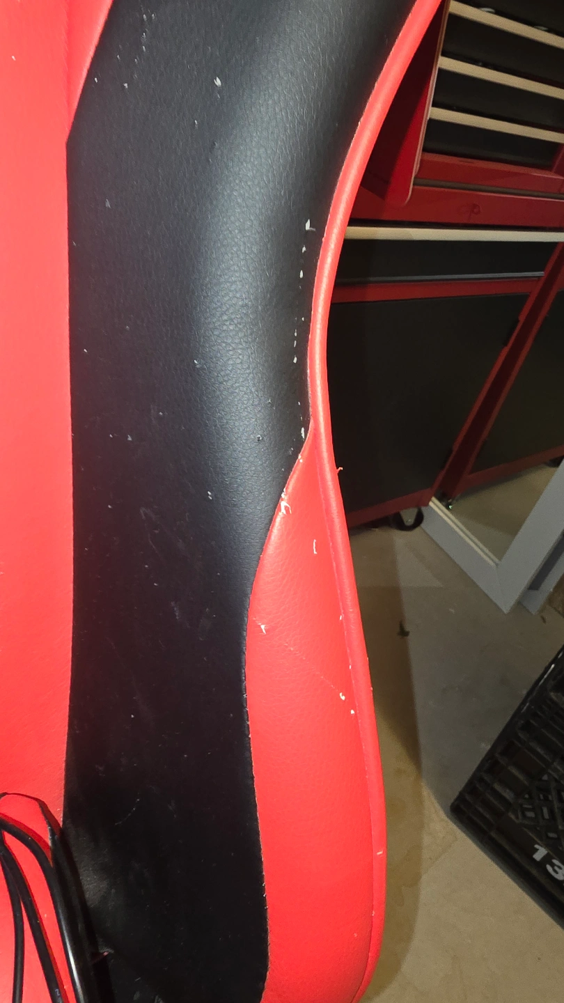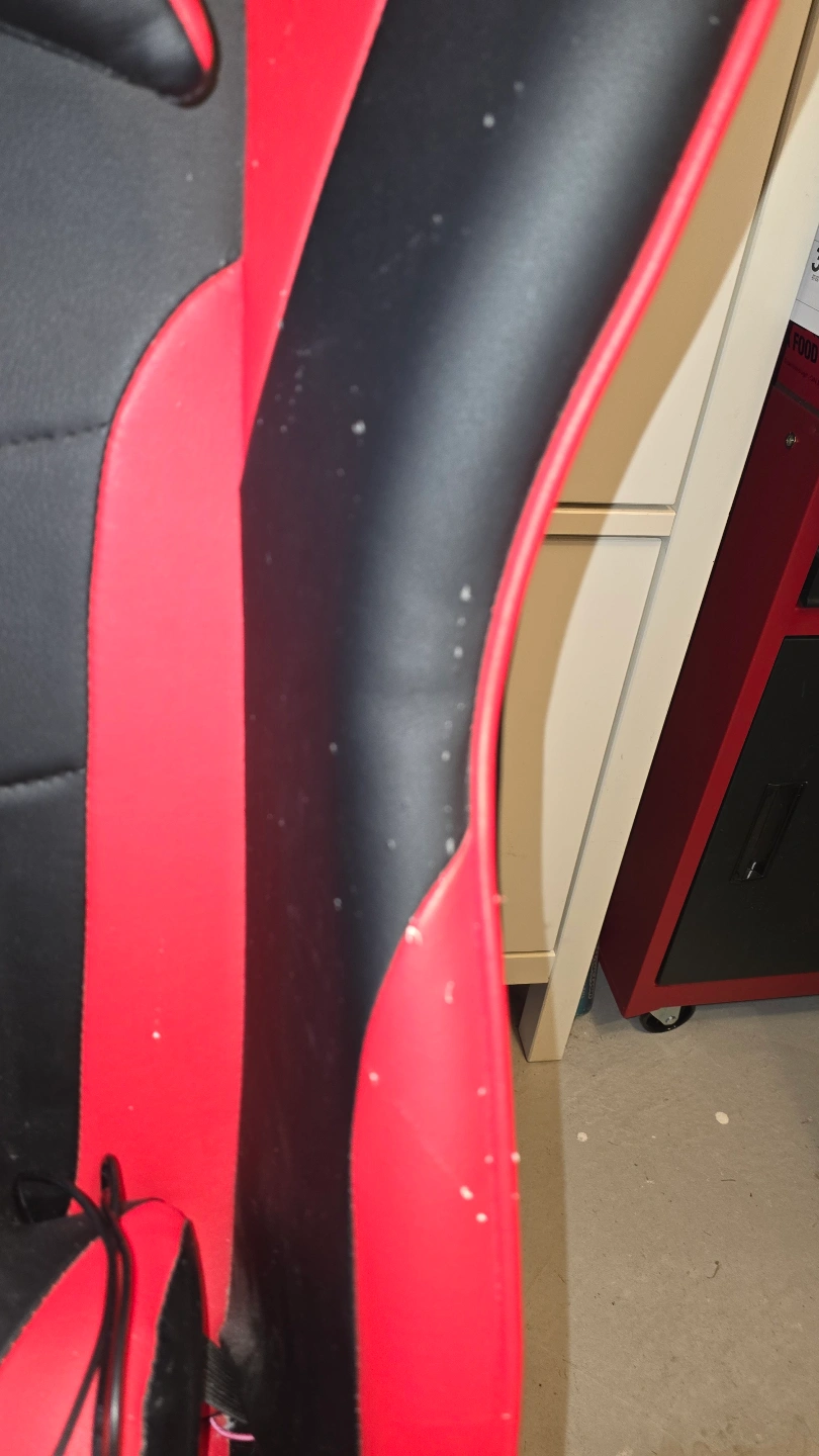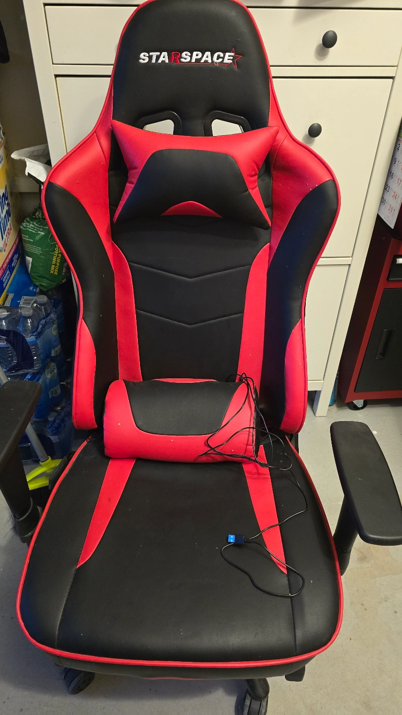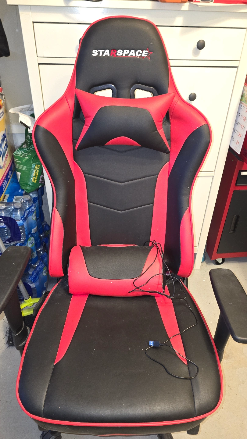 Used gaming chair, red and black. Includes headrest and lumbar support pillows. Some minor wear and tear.some cat scratches