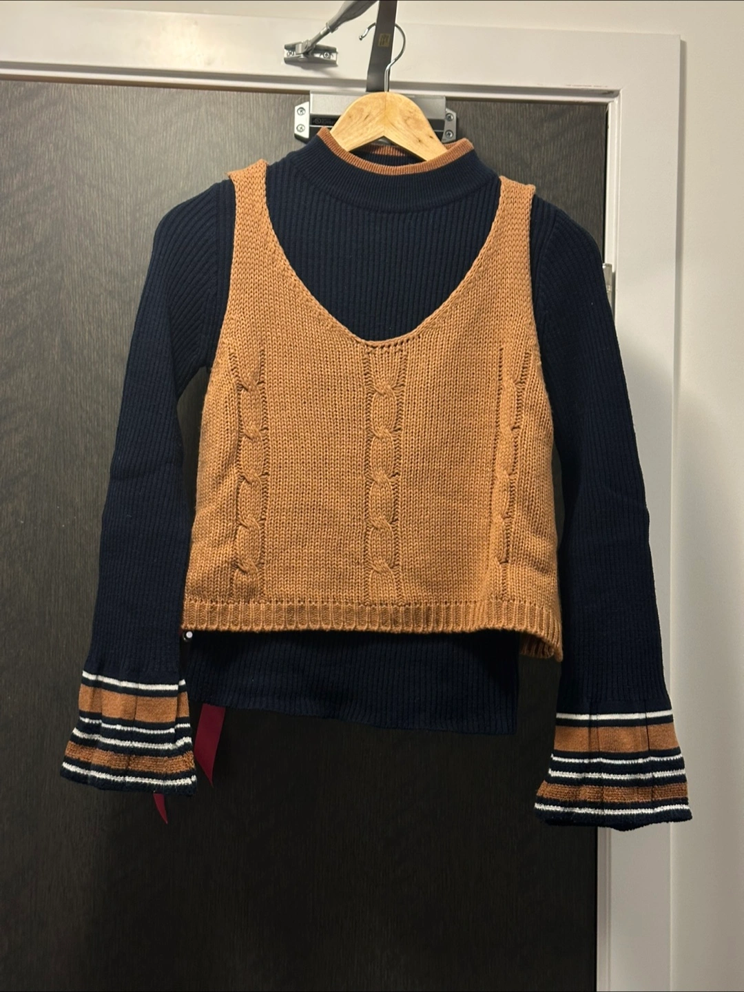 Adorable two-piece sweater set. Features a brown cropped cable knit vest over a navy blue long-sleeved mock neck sweater. Bell sleeves with white and brown stripes. Perfect for layering.