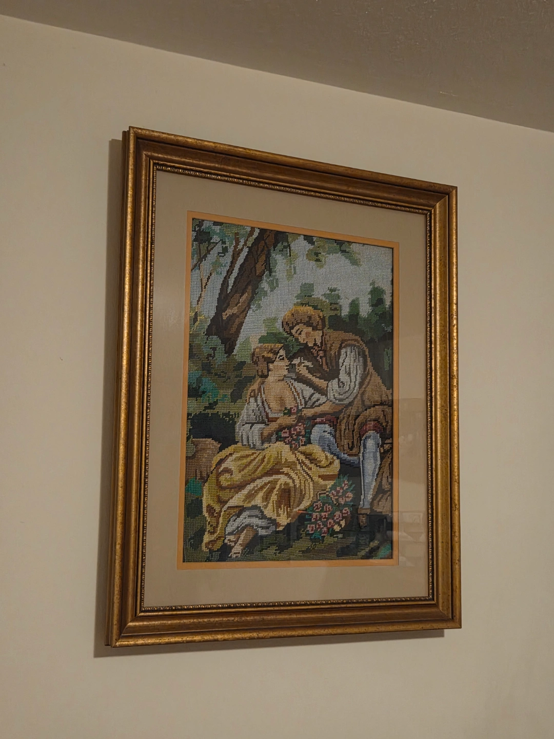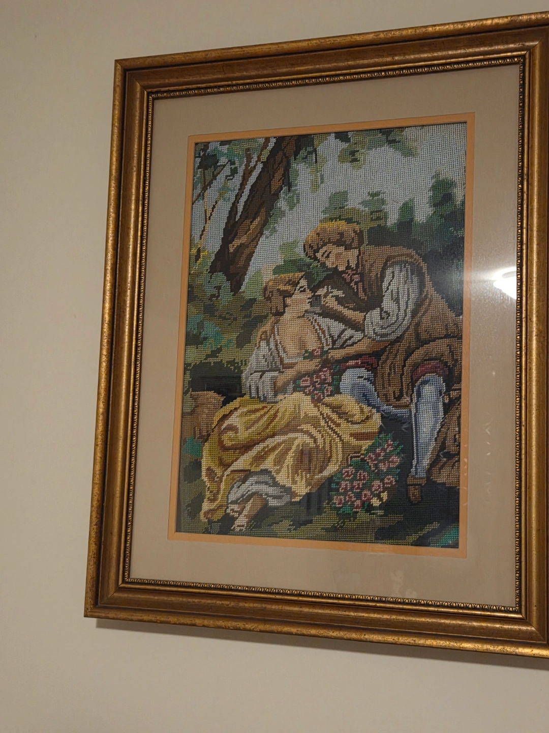 Beautiful vintage needlepoint artwork. Depicts a romantic couple in a pastoral setting. Gold coloured frame. Perfect addition to a home décor.