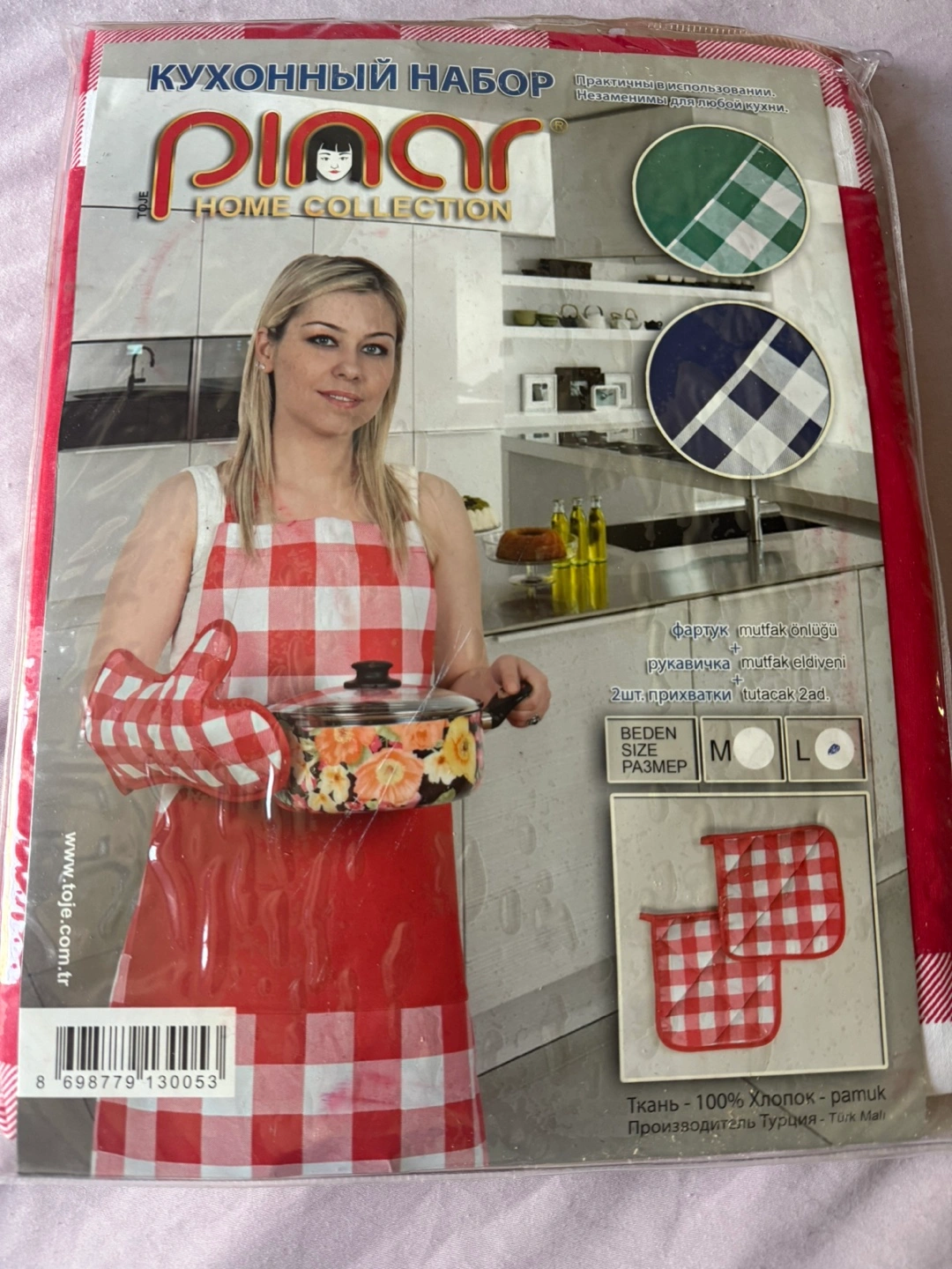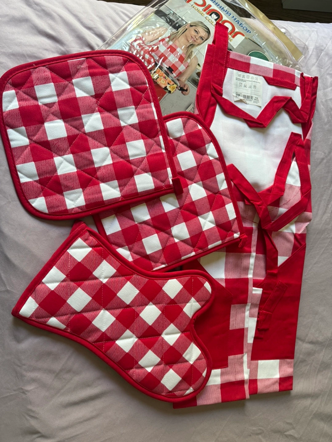 New kitchen set. Includes apron, oven mitts, and pot holders. Red and white gingham pattern. 100% cotton.