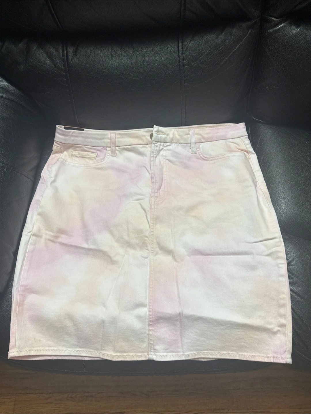 Adorable mini skirt. Features a tie-dye pattern in soft pastel colors. Looks great with a cute top and sandals. Perfect for spring and summer.