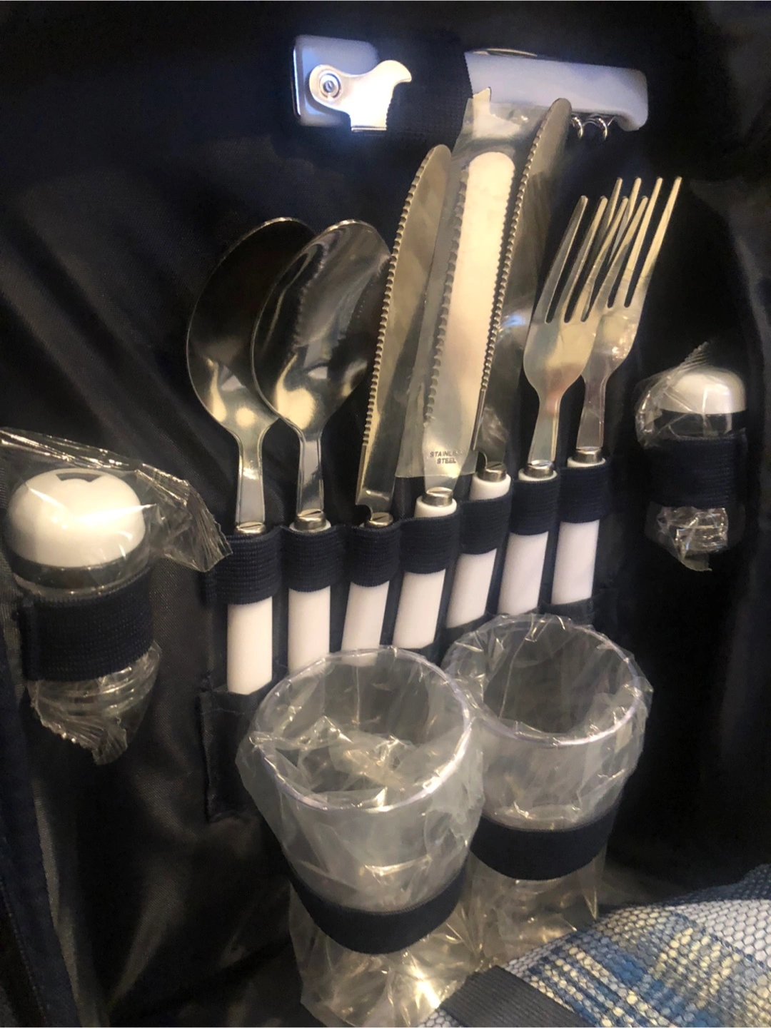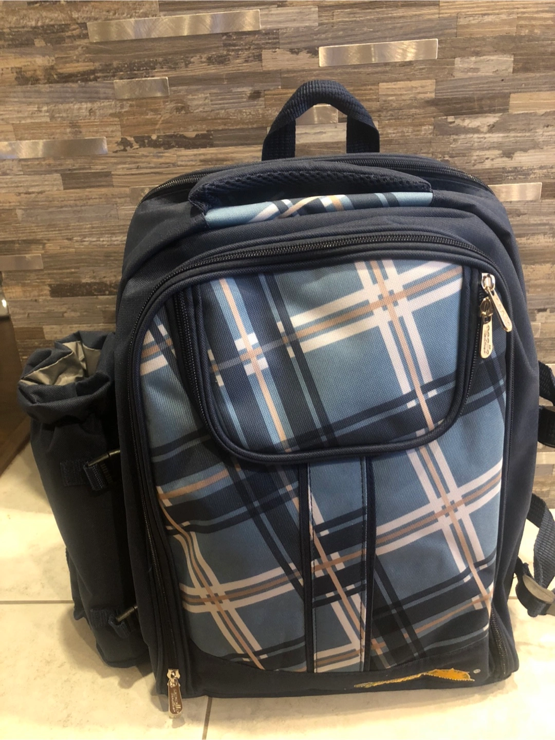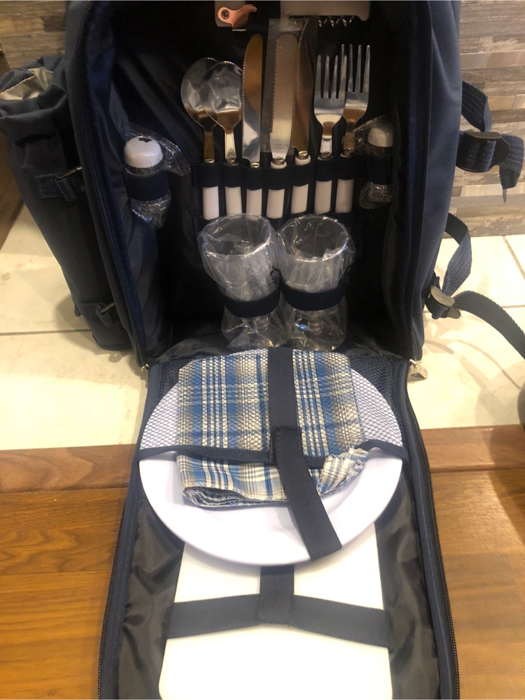 Portable picnic backpack. Includes plates, cutlery, glasses, napkins, and salt and pepper shakers. Insulated main compartment. Insulated Bottle holder on the side. Perfect for outdoor adventures.
