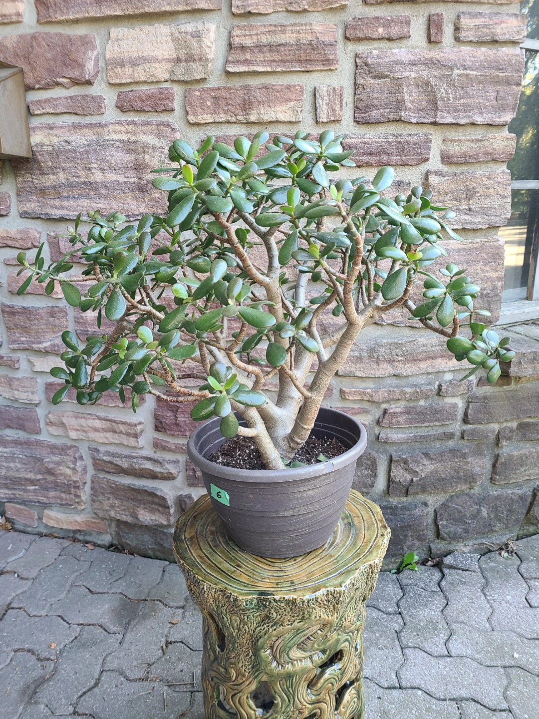 Mature jade plant, approximately 2 feet tall. Healthy-looking, in a dark grey plastic pot. Potted in soil. Great addition to your home.