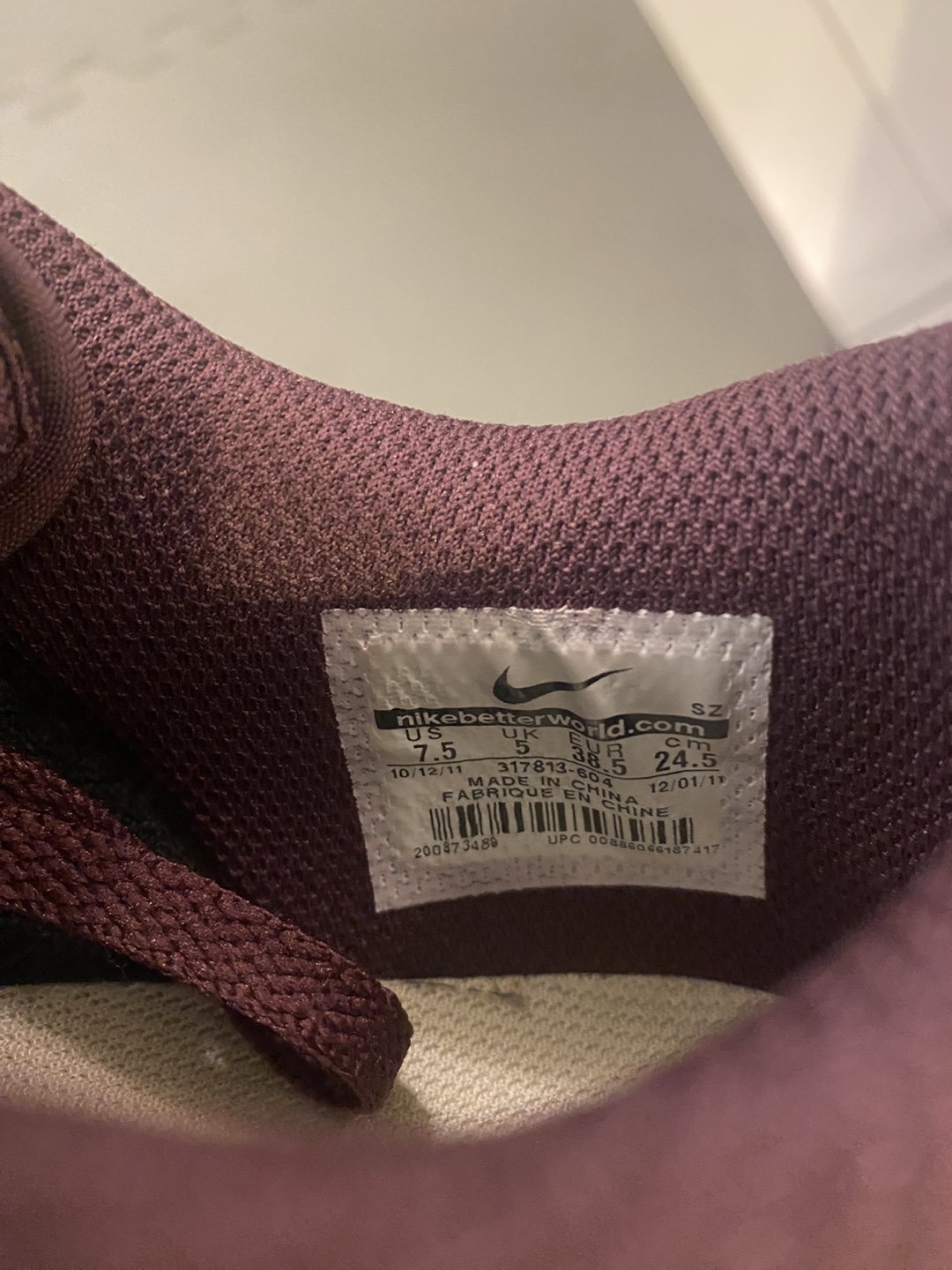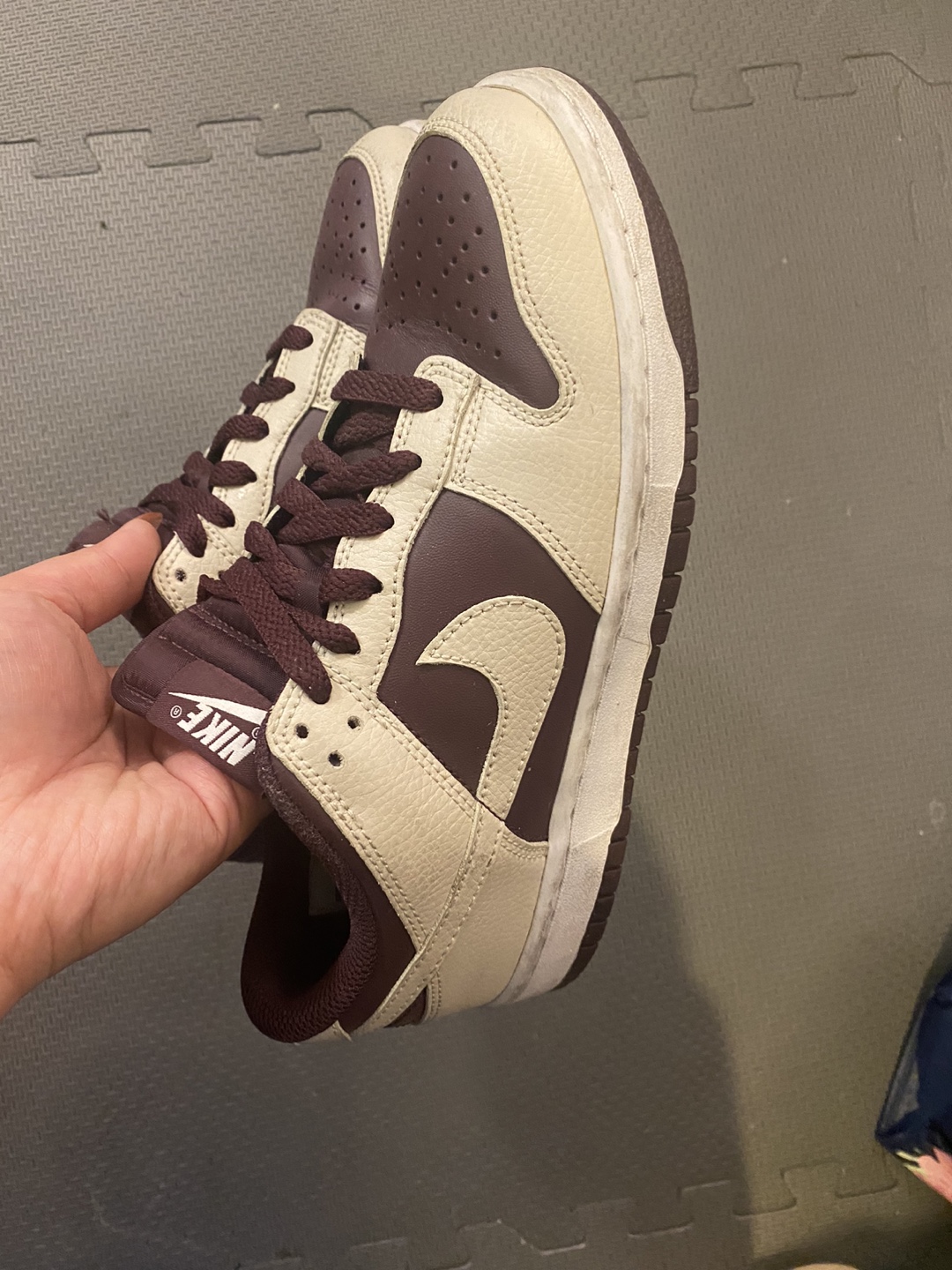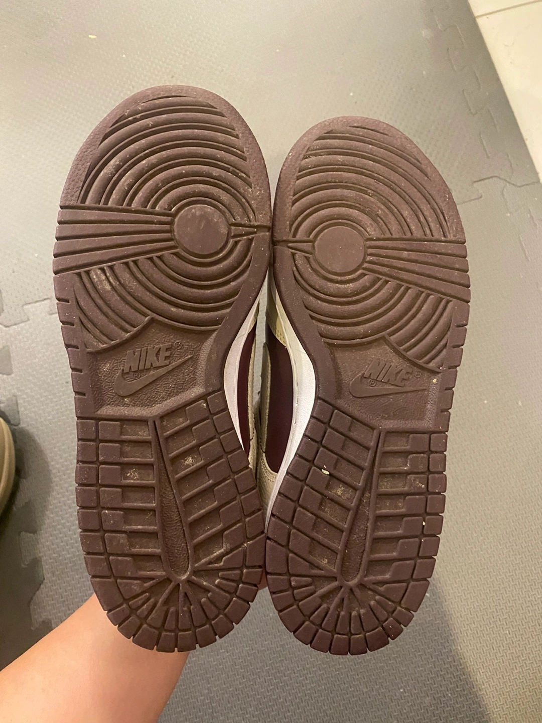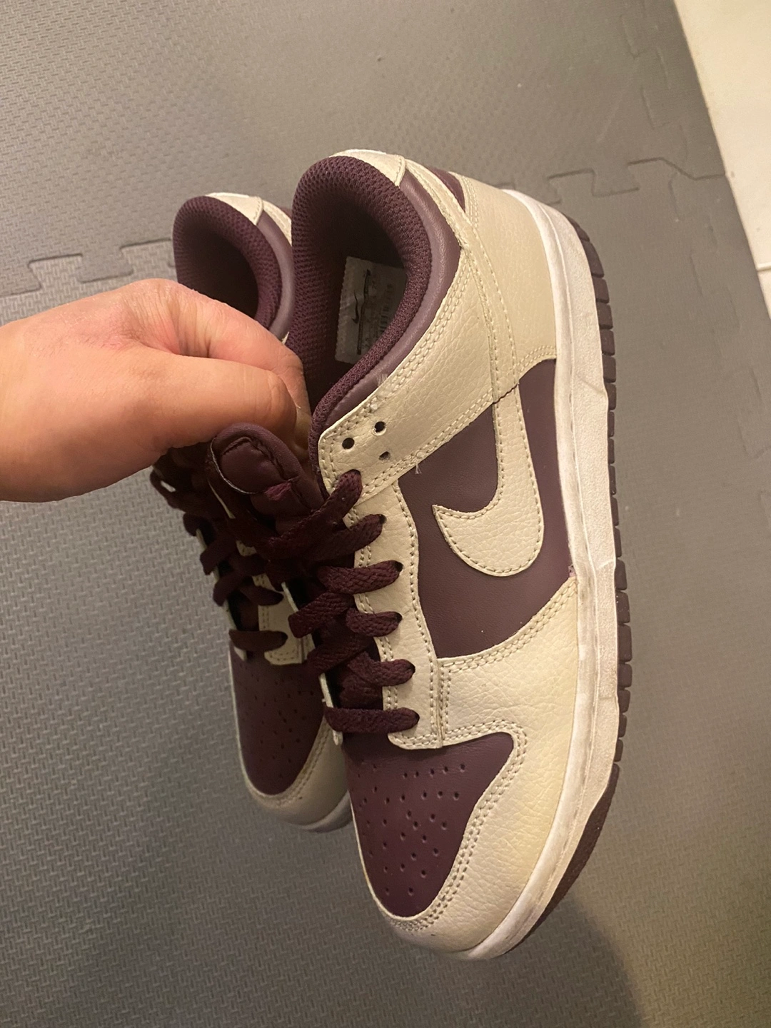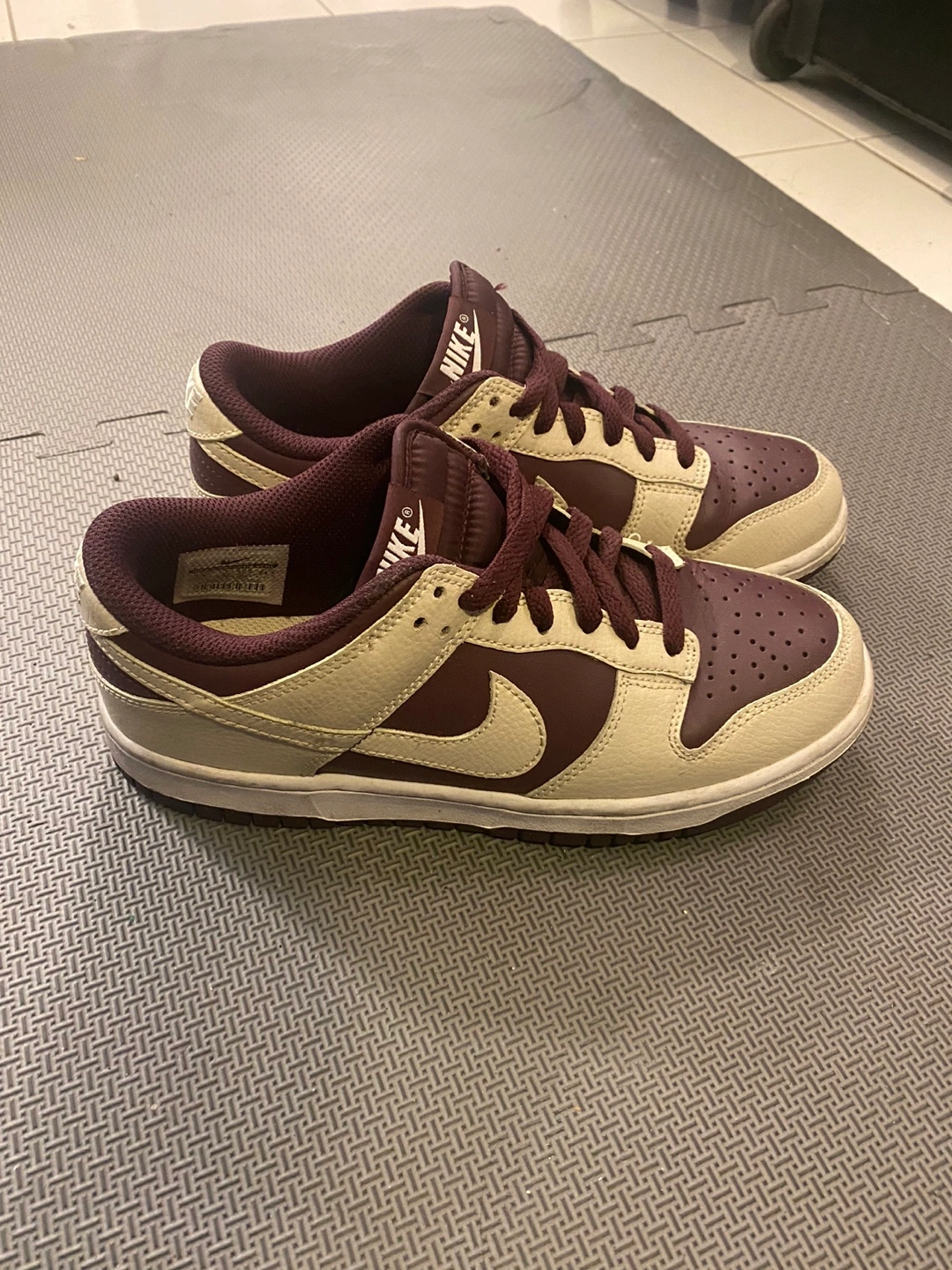 Pre-owned Nike Dunk Low sneakers. Burgundy and beige colourway. Women's size 7.5. Some wear and tear but barely noticeable after you give them a good clean.