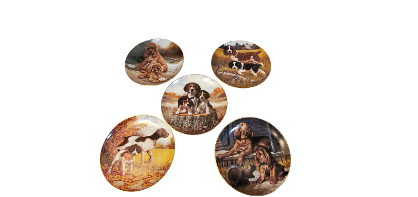 Five collectible porcelain plates. Limited edition. Depicts various sporting dog breeds. The Hamilton Collection. Made in the U.S.A.