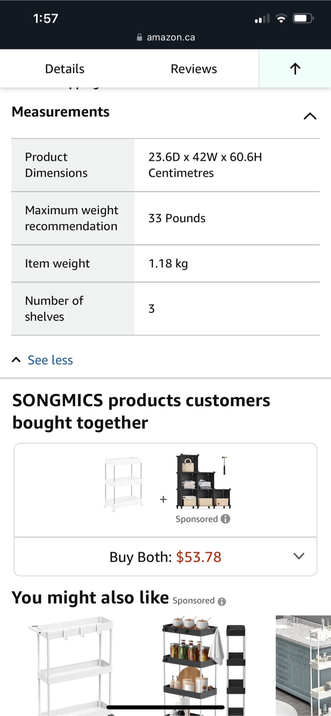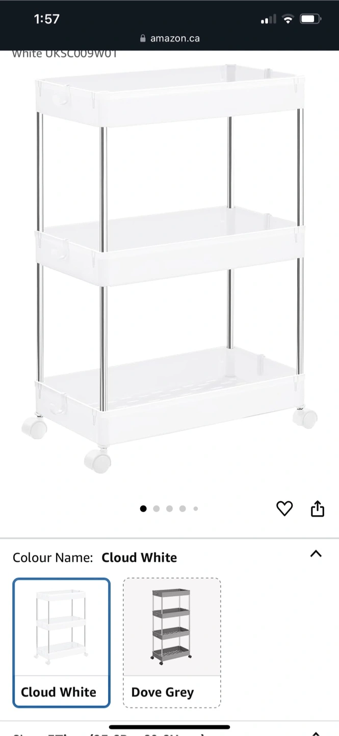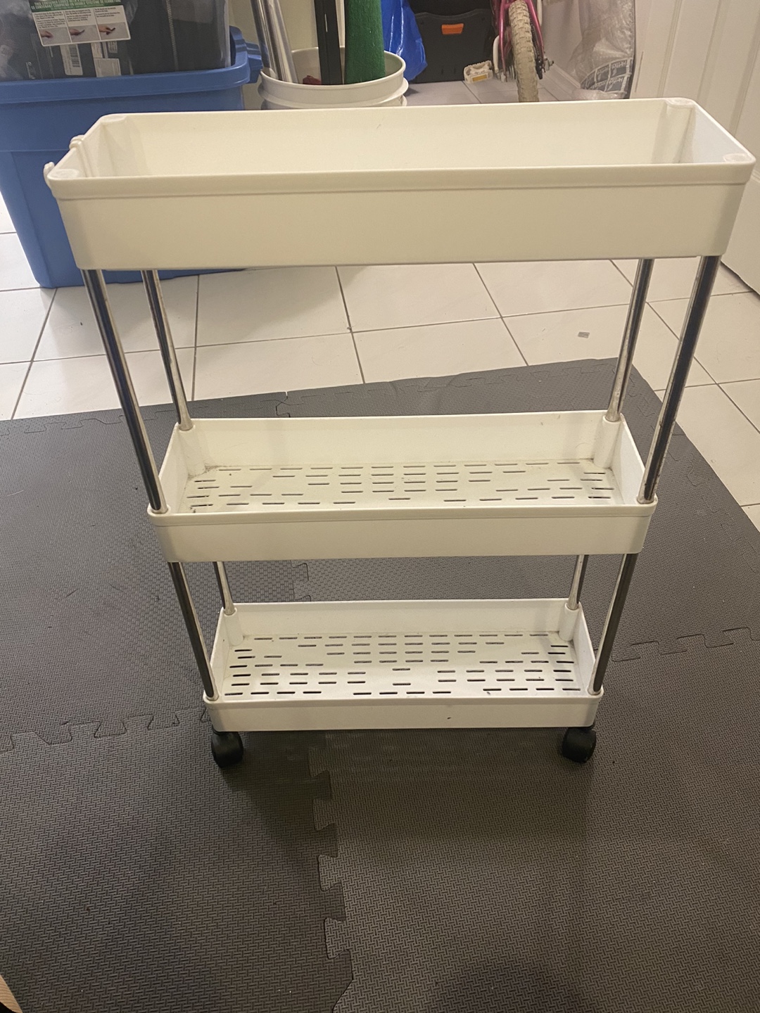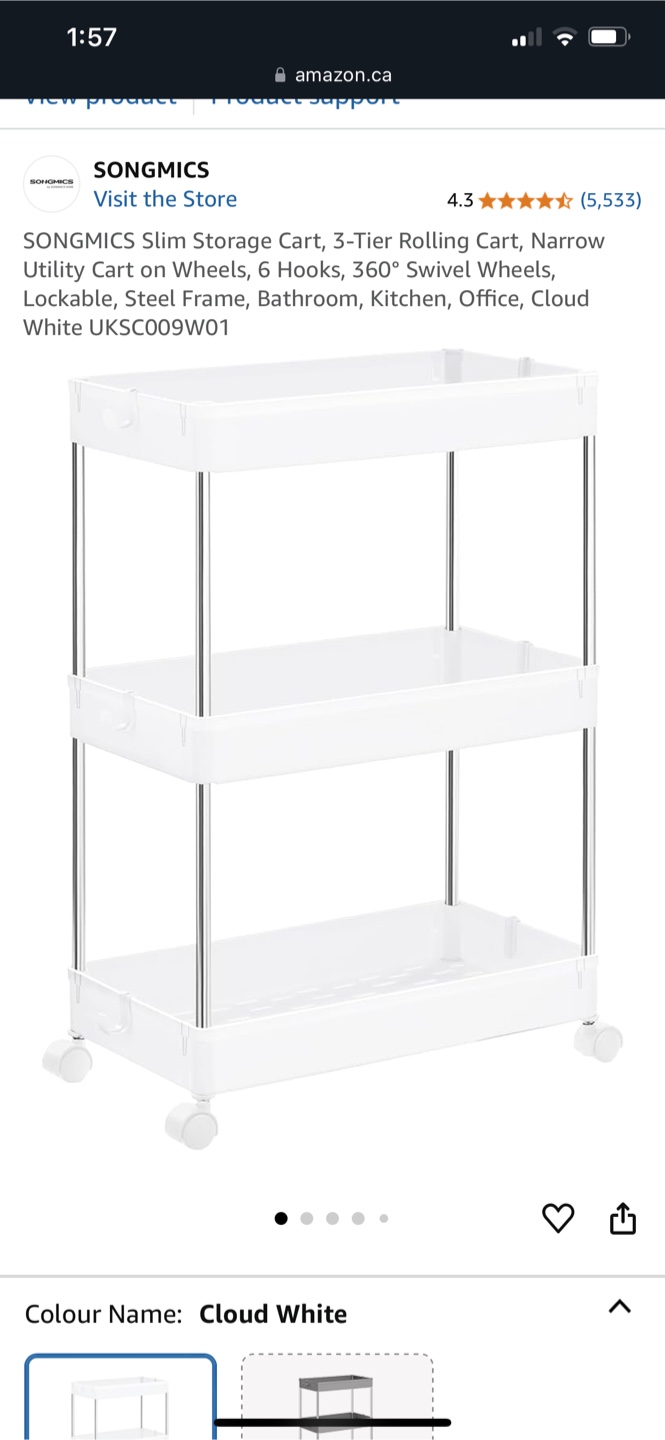 Slim storage cart. Three shelves. Narrow utility cart. Six hooks. 360° swivel wheels. Lockable. Cloud white. Kitchen, office, bathroom.