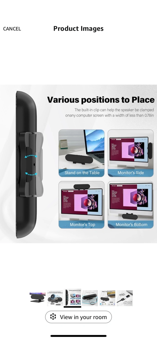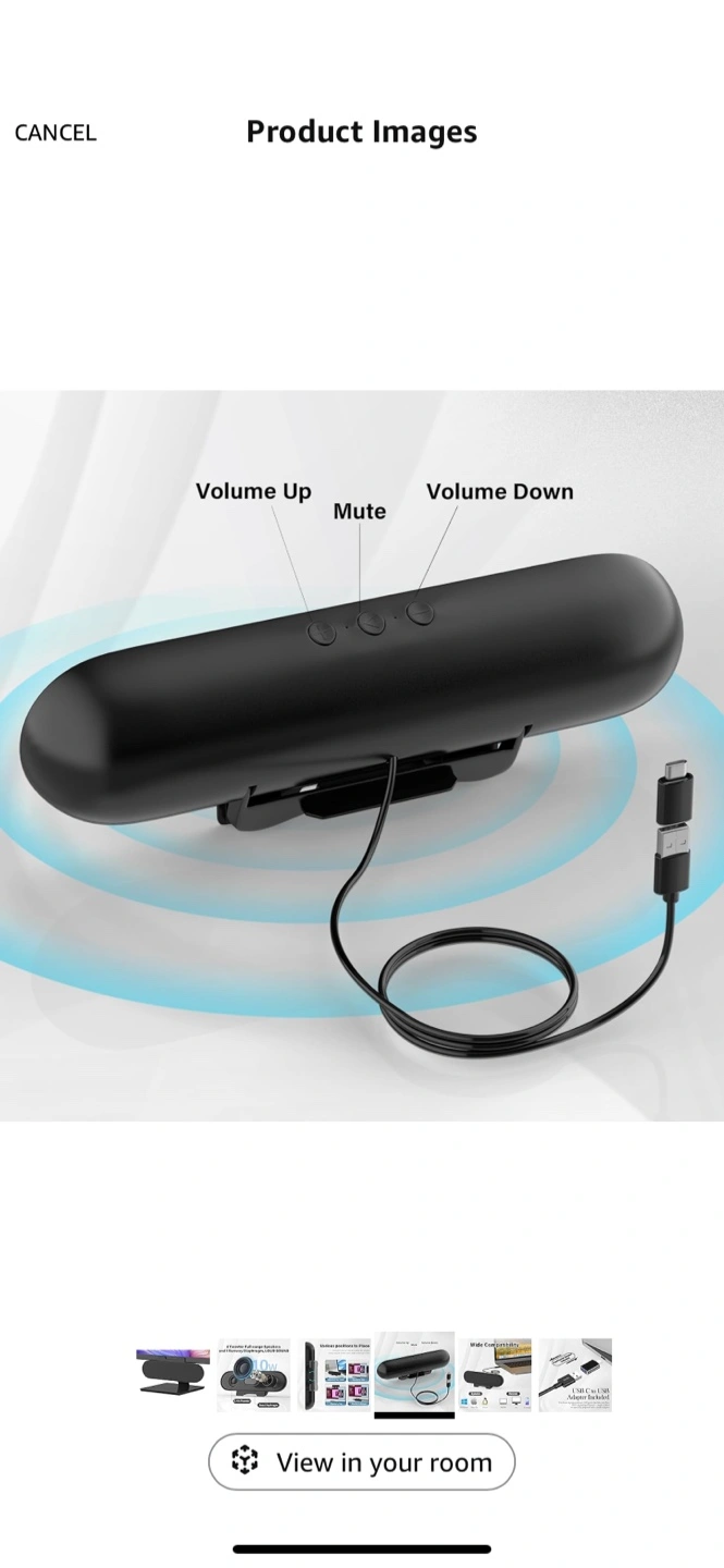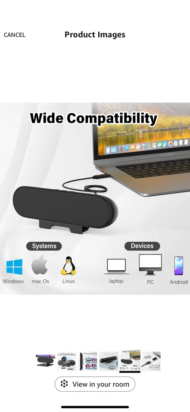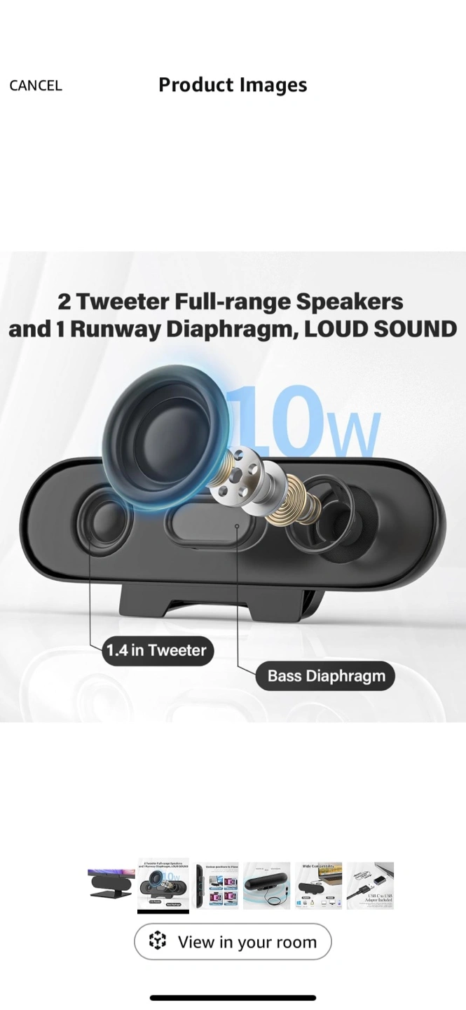 Slim computer speakers. Two tweeters and a bass diaphragm. Loud sound. Includes USB-C to USB adapter. Volume controls. Attaches to monitors or sits on a desk. Compatible with Windows, macOS, and Linux.