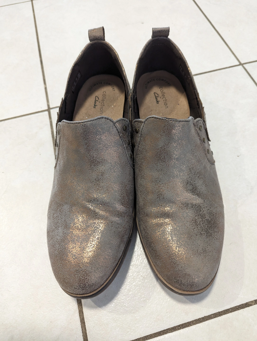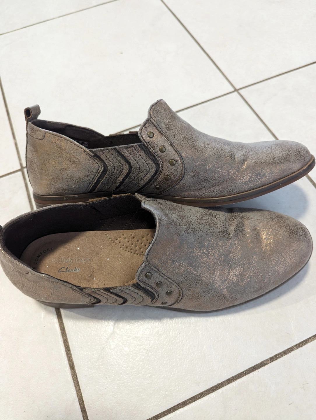 Metallic rose gold slip-on shoes. Unique chevron detail. Slight wear. Comfortable design.