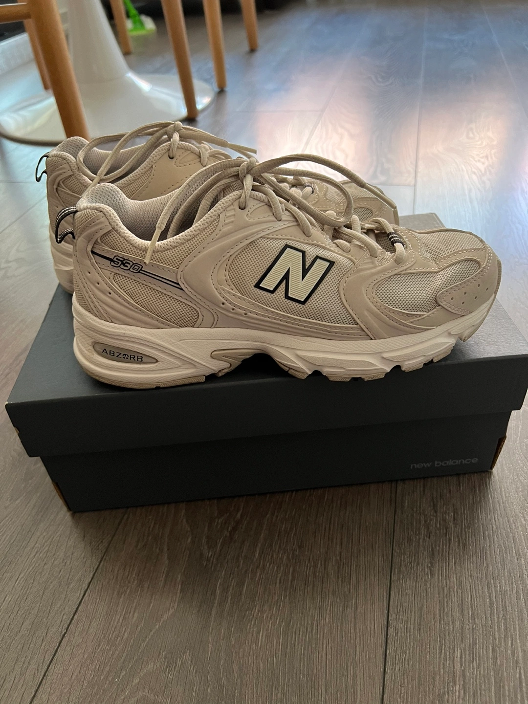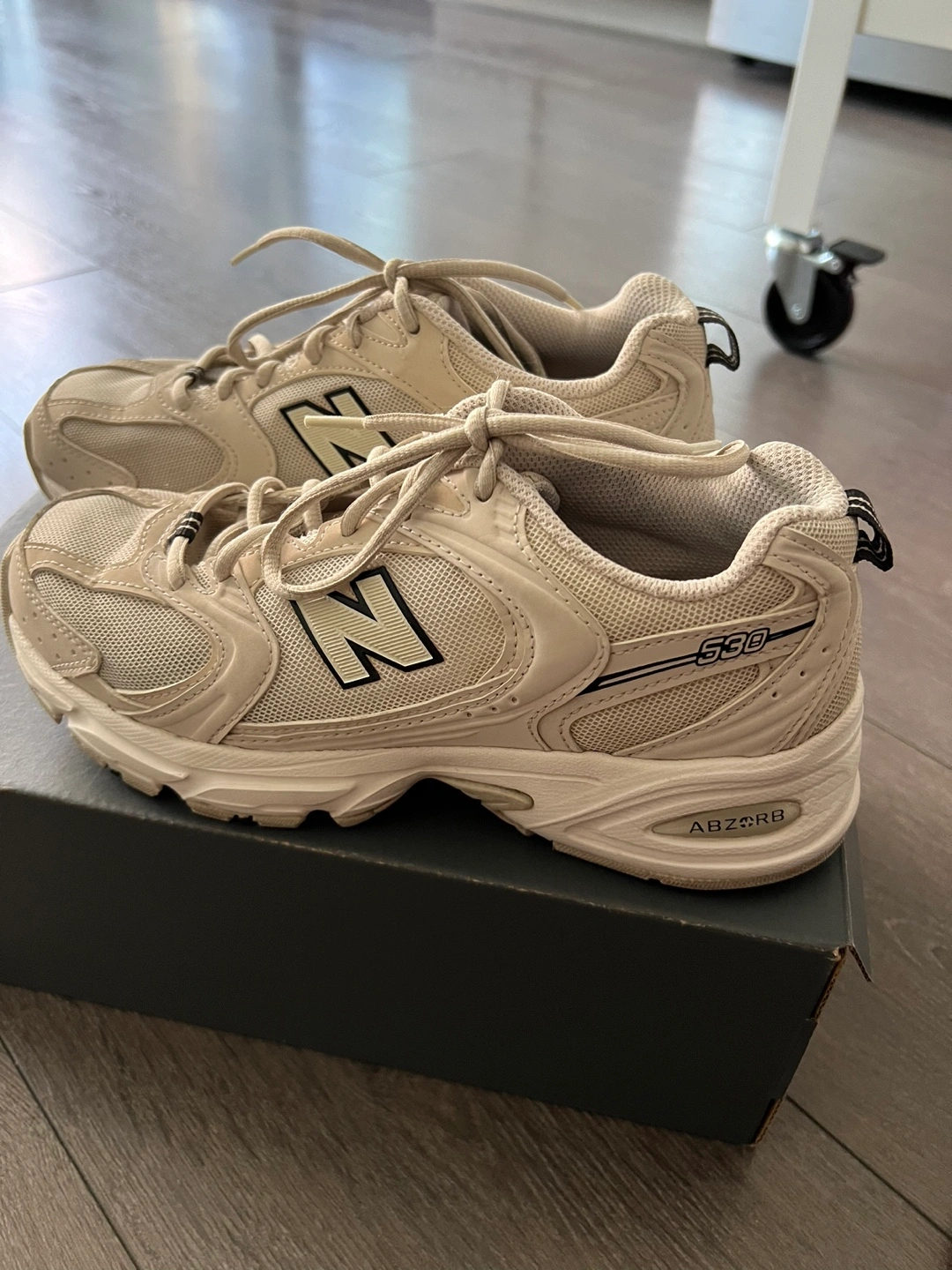New Balance 530 sneakers. Beige colour. Size 6.5 US. ABZORB cushioning. Good condition. Comes in original box.