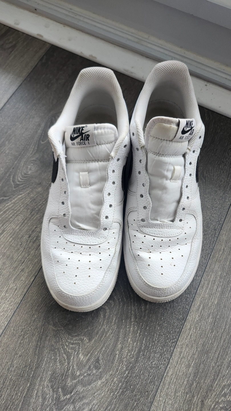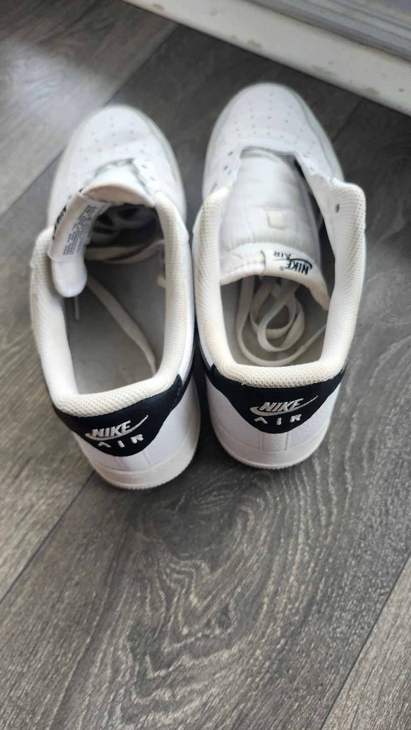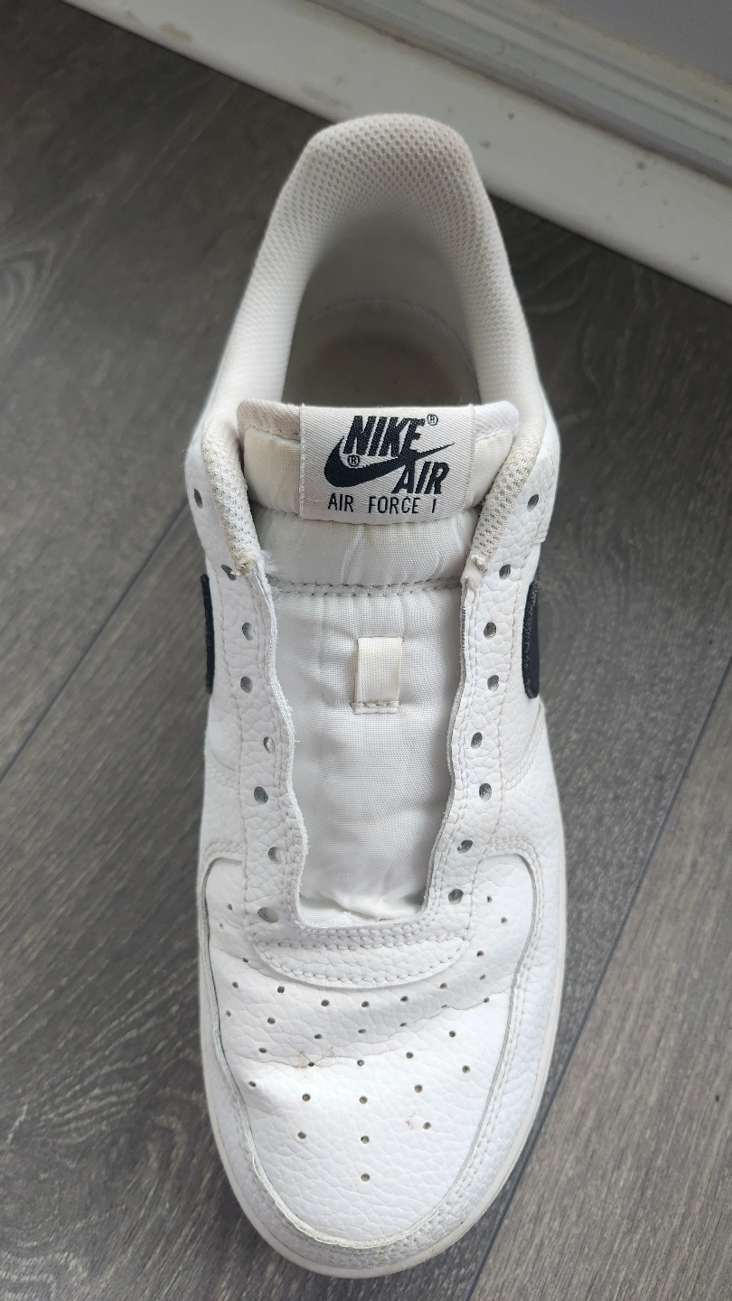 Men's white leather Nike Air Force 1 sneakers. Classic design, low-top style. Black swoosh logo. Some wear and tear visible.