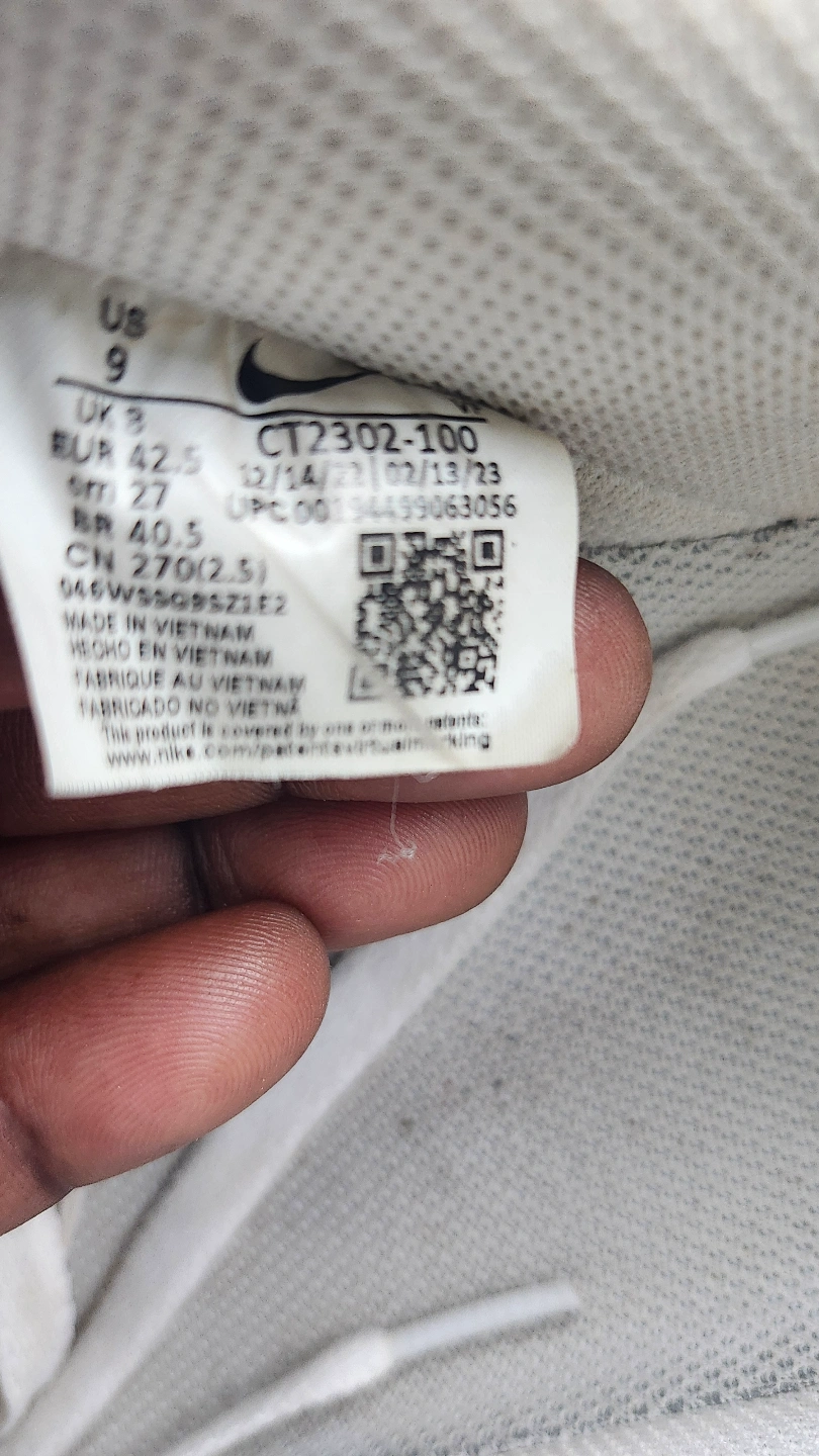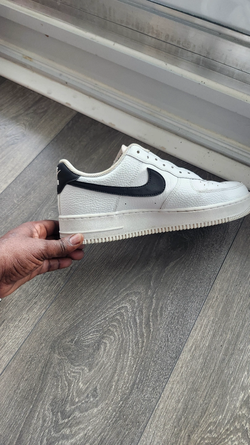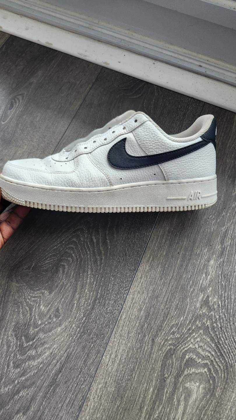 Men's white leather Nike Air Force 1 sneakers. Classic design, low-top style. Black swoosh logo. Some wear and tear visible.