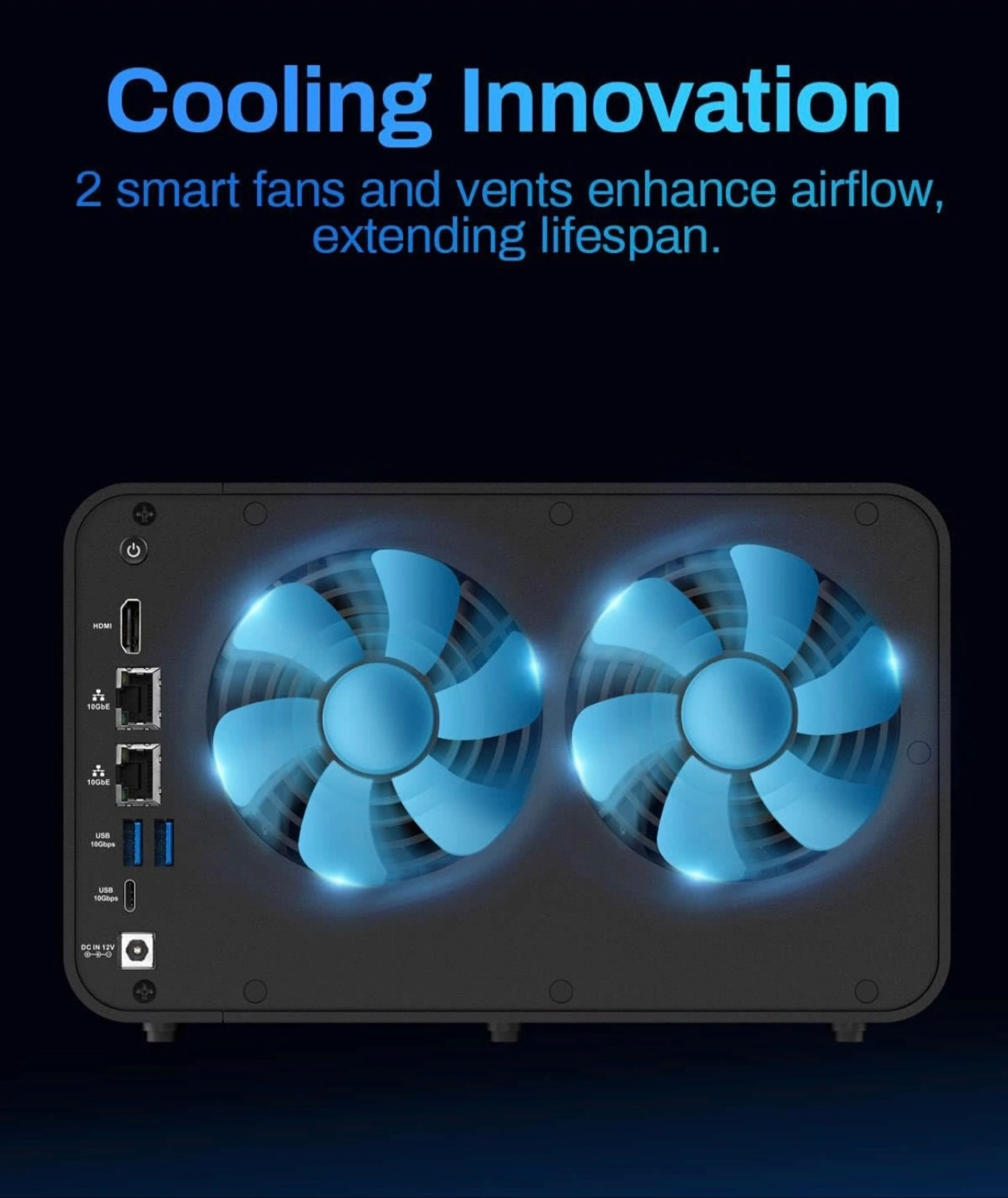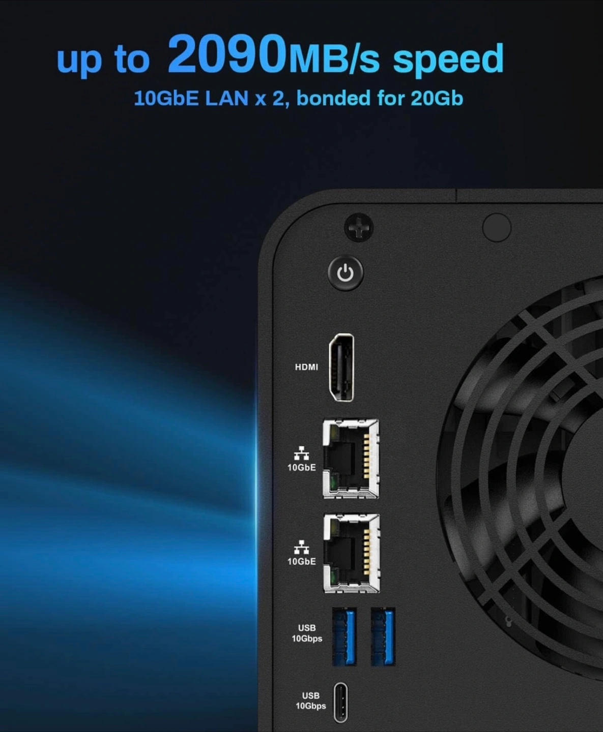6-bay NAS storage server. Powerful 10-core CPU and 8GB DDR5 RAM. Dual 10GbE ports for fast network speeds. Ultra-quiet operation. Includes multiple USB and HDMI ports.