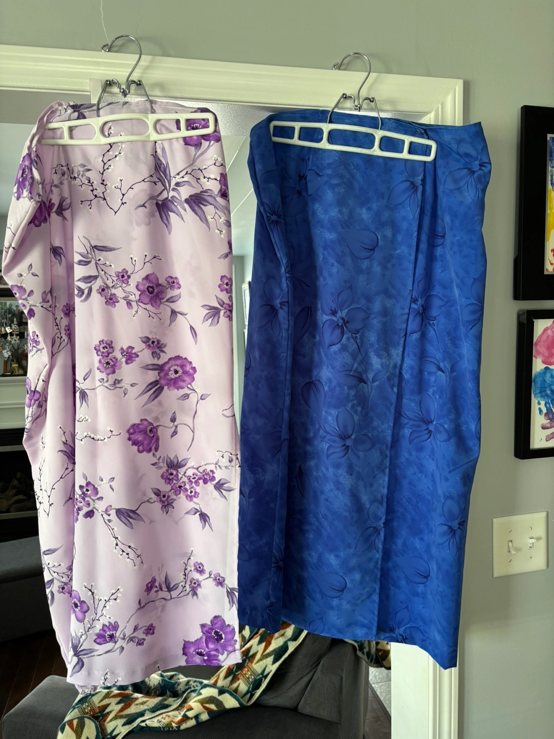 Pair of women's 3/4 length midi skirts. One lavender with purple floral print, and back slit. The royal blue with blue floral print is a rap around type skirt. Both are made of a lightweight polyester material. Great for summer.