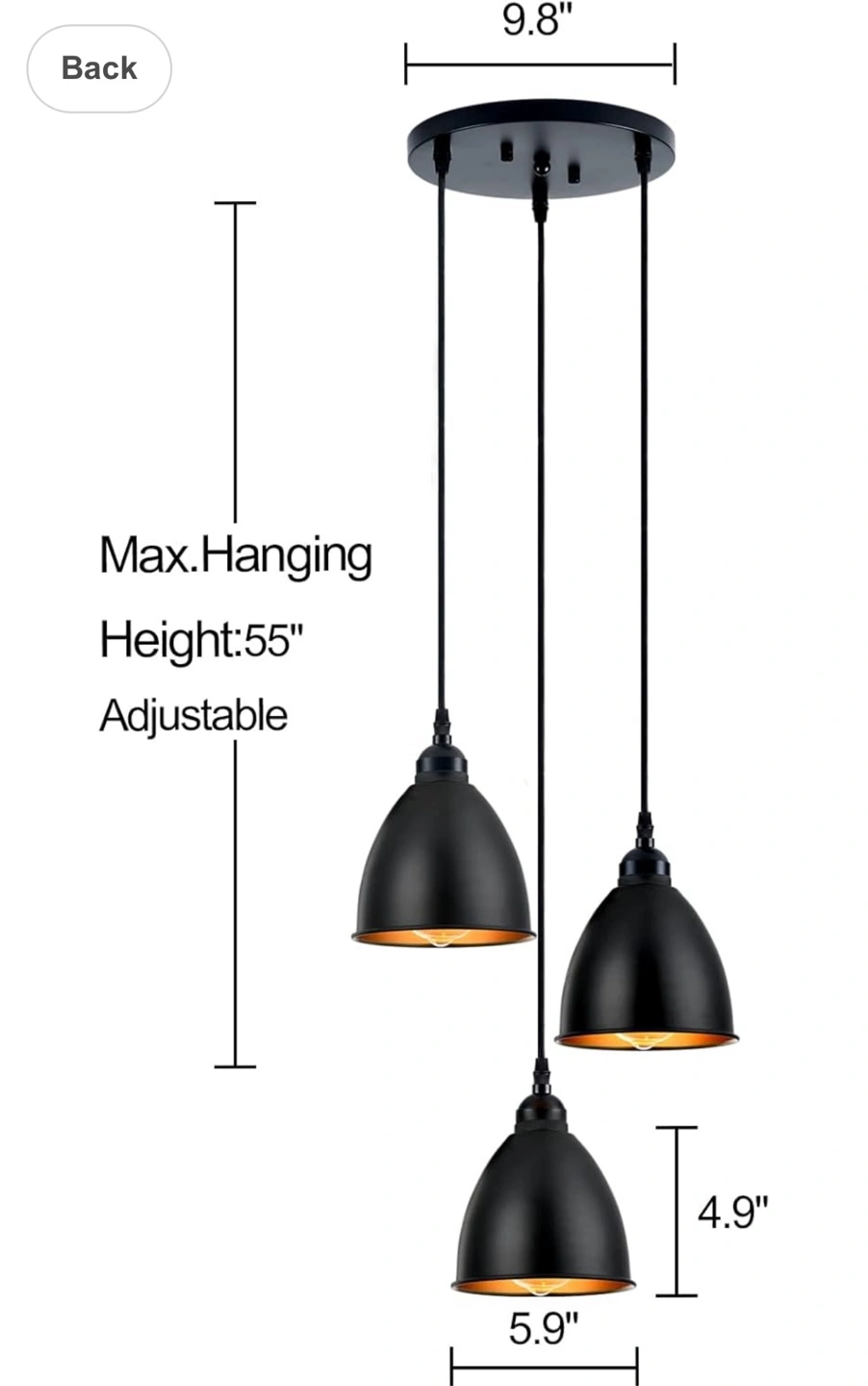 Installation:Three wires are the same length (Max Length:55"),you customize the hanging height for better lighting effect and desired look,it also flexibility hang at sloped ceiling.You can aline three metal shades in the same level or put 3 metal shades at 3 different levels, creating a cascading, flowing contemporary look.