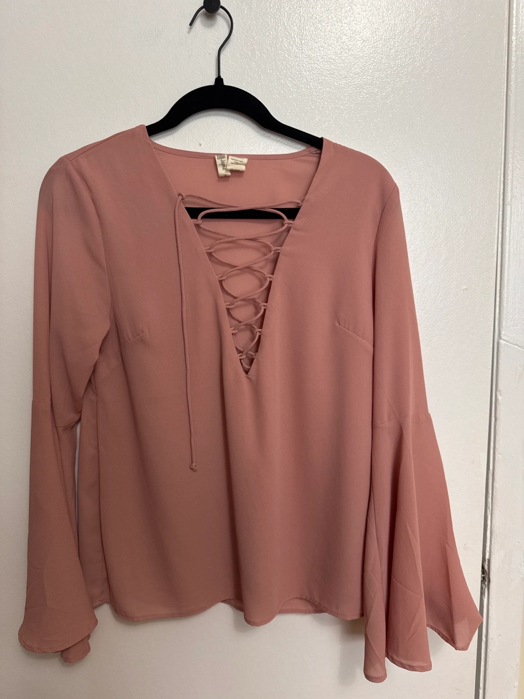 Long sleeve mauve blouse. Features a lace-up detail at the neckline and bell sleeves. Lightweight material.