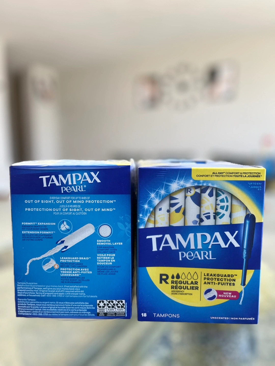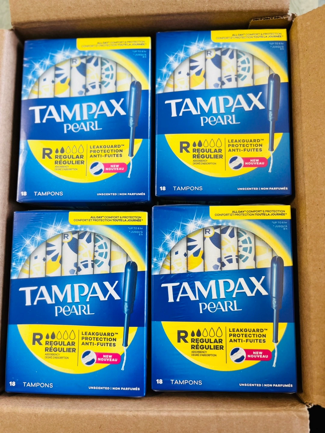 Box of Tampax Pearl tampons. Regular absorbency. Unscented. LeakGuard protection. 18 tampons per box. Multiple boxes available. Each 5$ three for 15$