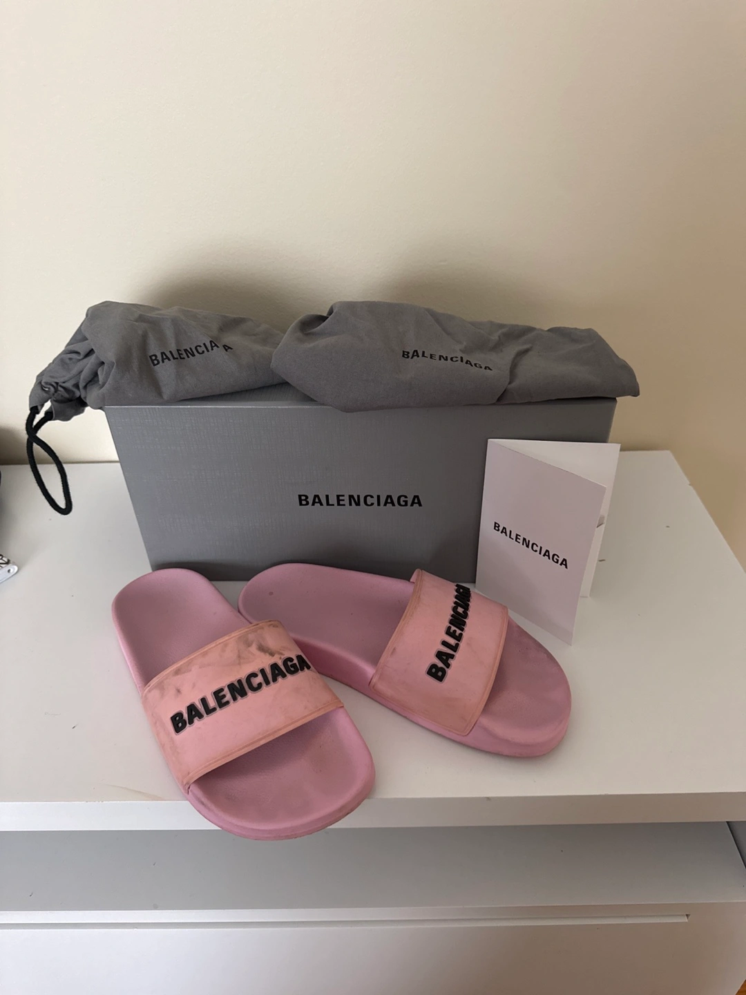 Pink Balenciaga slides. Logo on the strap. Bought in 2021. Comes with original receipt box and dust bags. Some discolouration that can easily be wiped off.