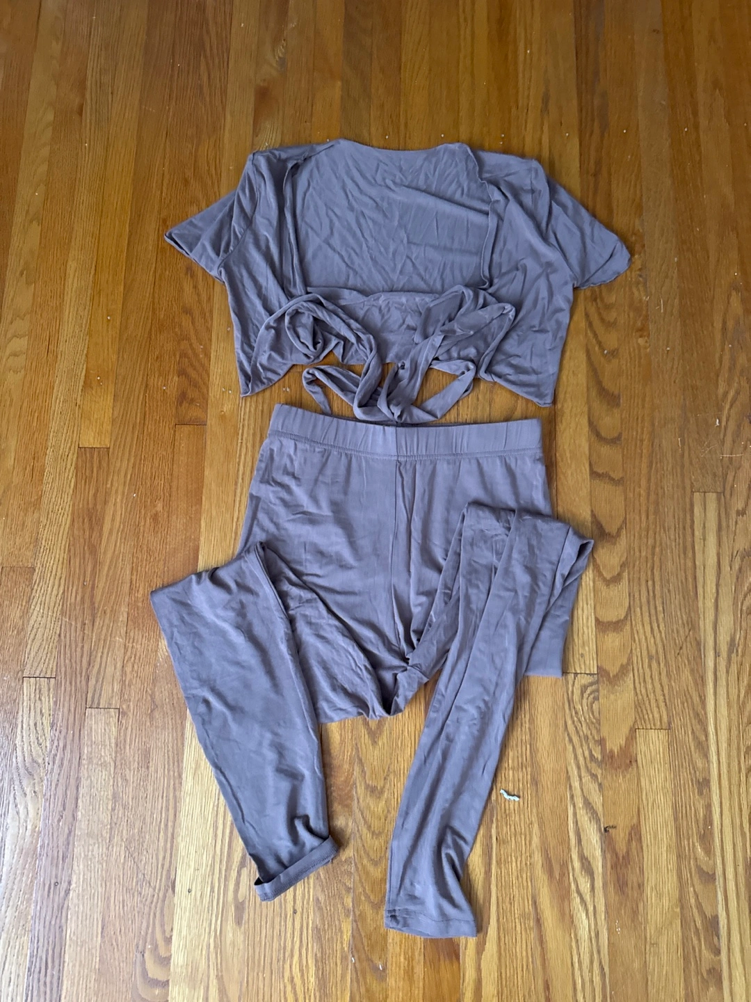 Comfortable mauve two-piece lounge set. Features a cropped, tie-front top and coordinating leggings. Soft and stretchy light weight material.