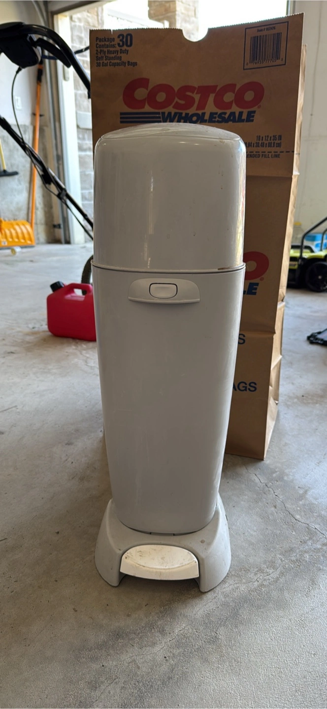 Grey diaper pail. Foot pedal operation. Used condition.
