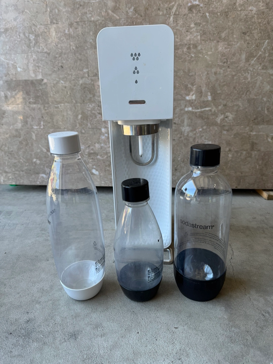 White SodaStream sparkling water maker. Includes three carbonation bottles. Used condition.