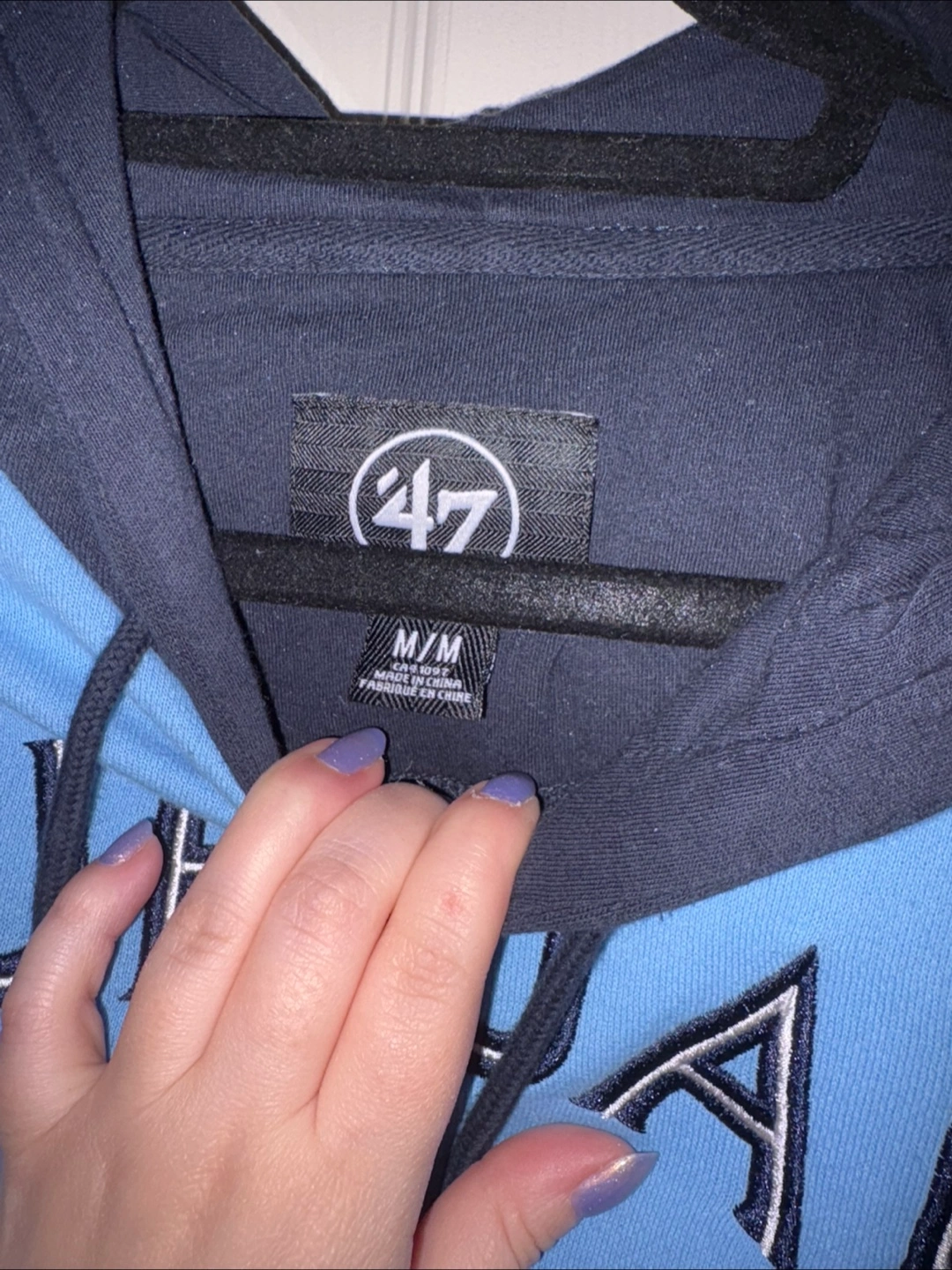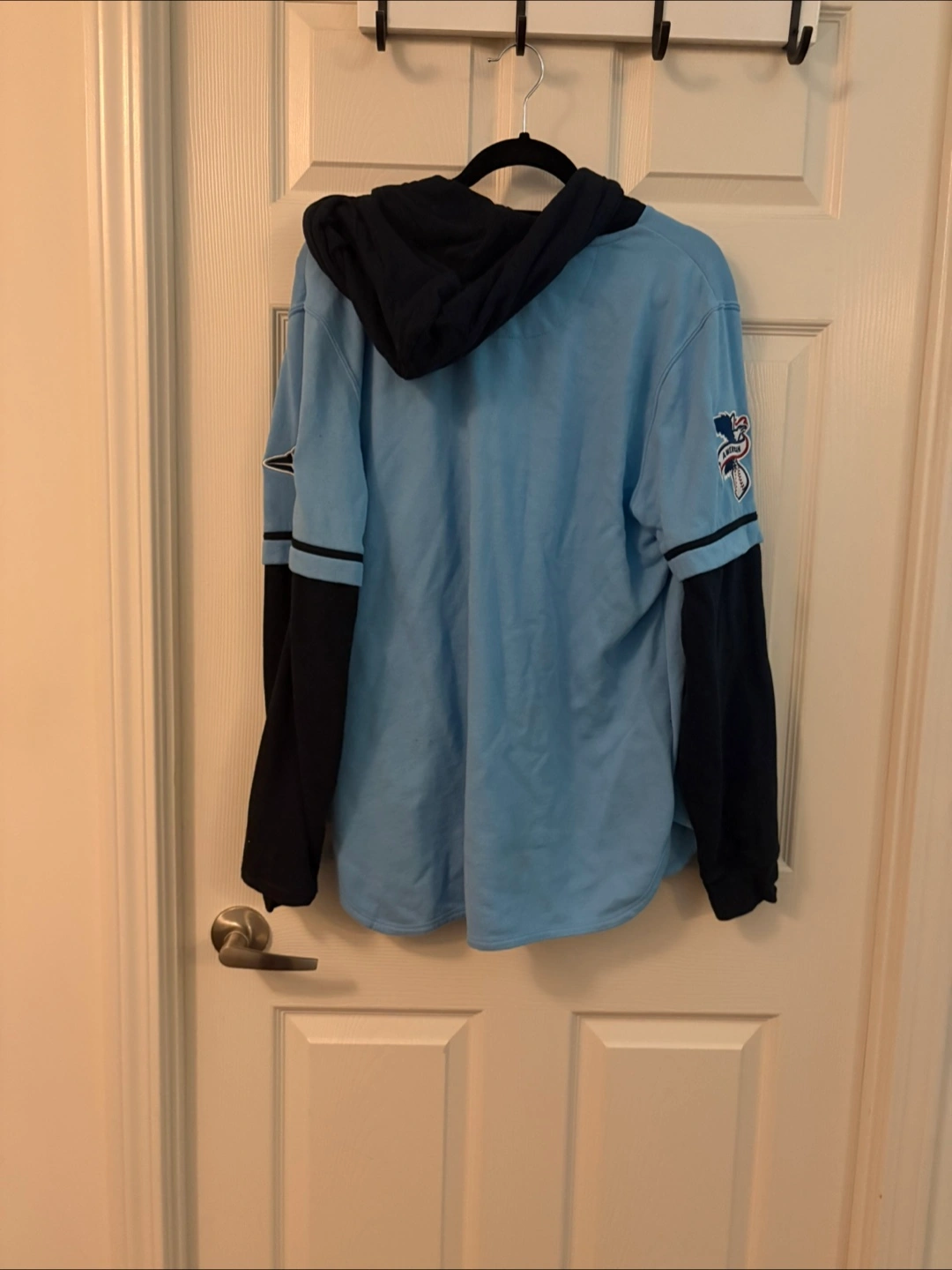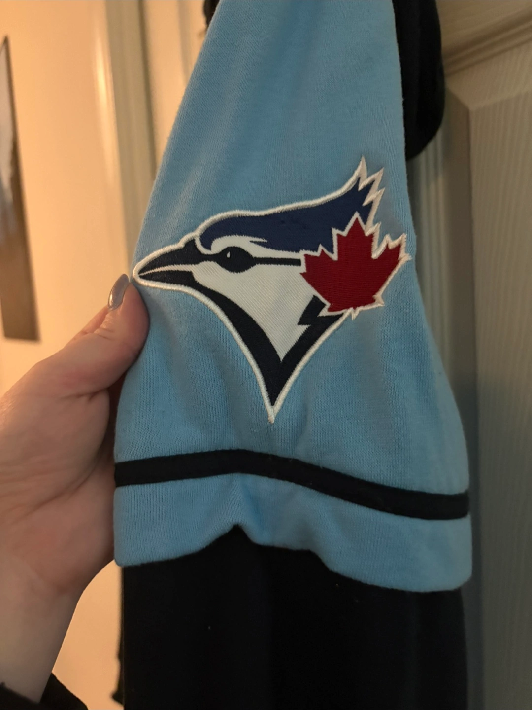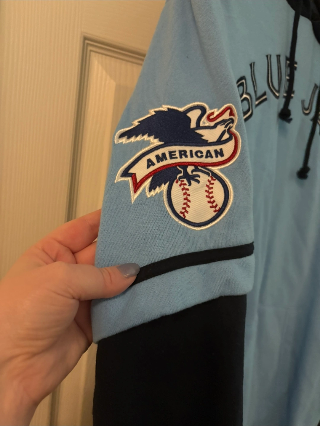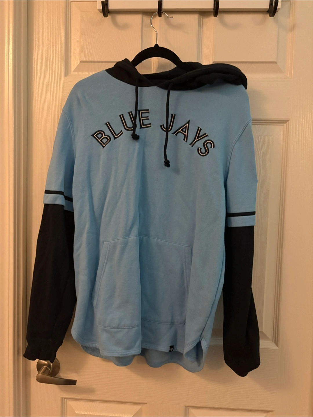 Blue Jays hoodie. New blue body with navy sleeves. Features team logo patches and embroidered lettering. Medium size.