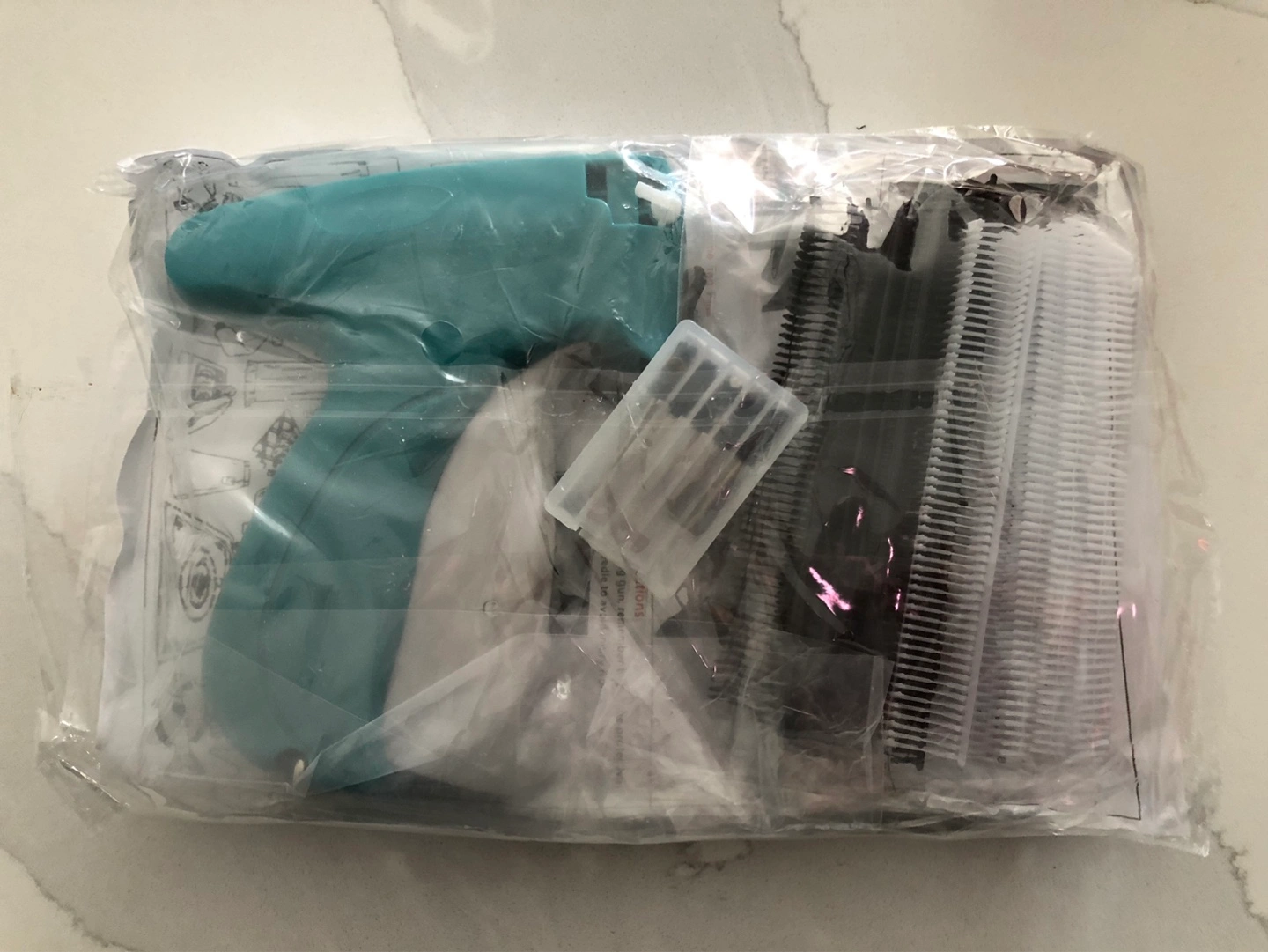 New in package. Teal clothing tag gun, includes tags and needles. Perfect for tagging clothing.