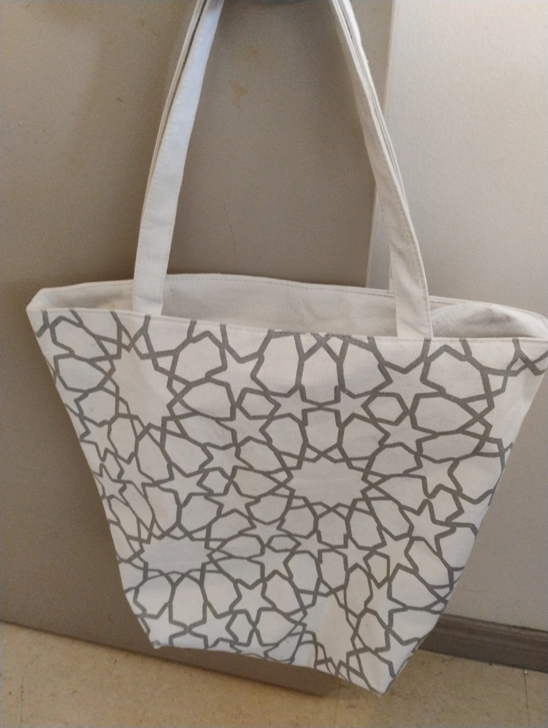 438Large tote bag. White canvas with a grey geometric pattern. Two shoulder straps. Perfect for shopping or the beach.