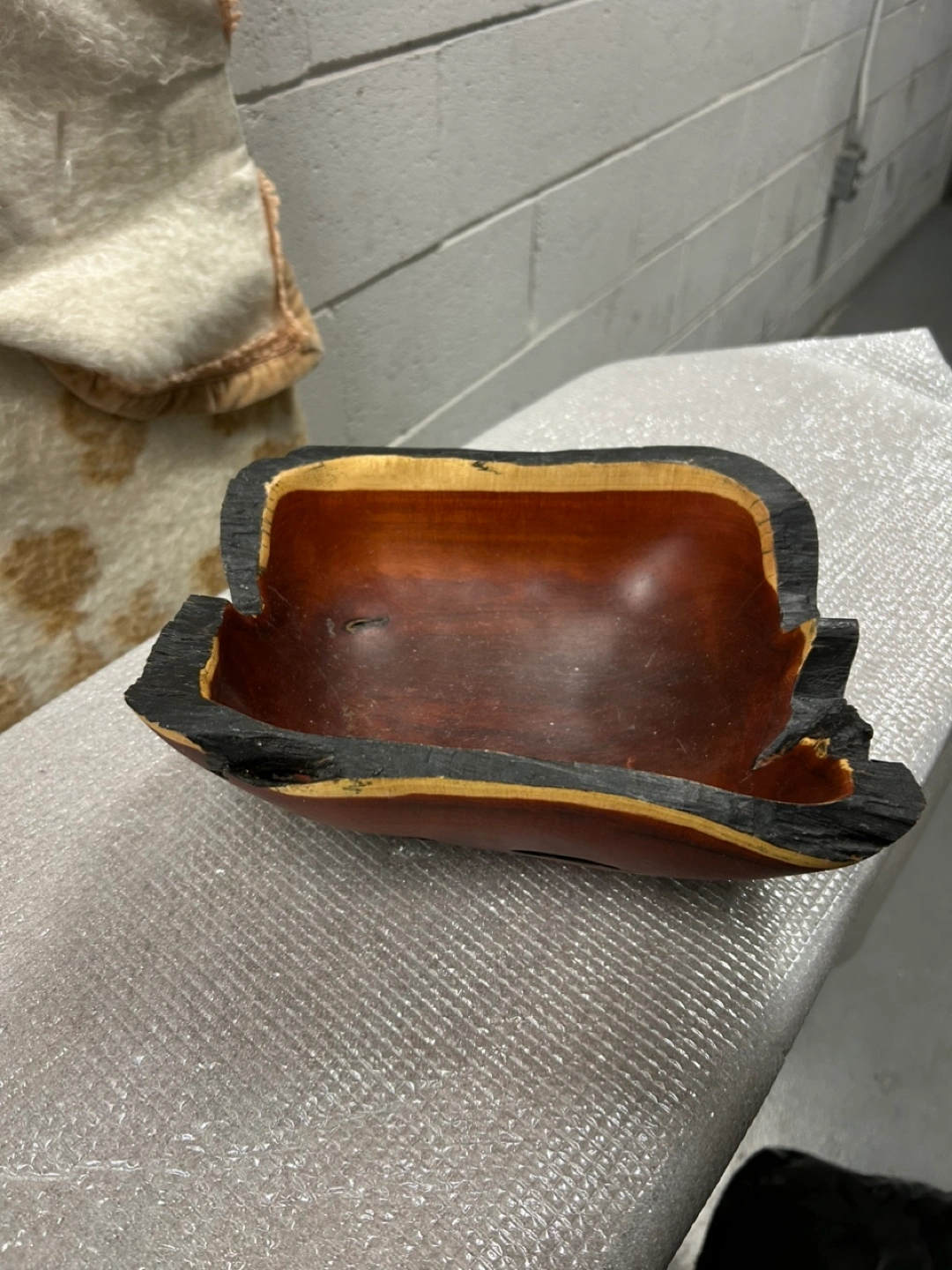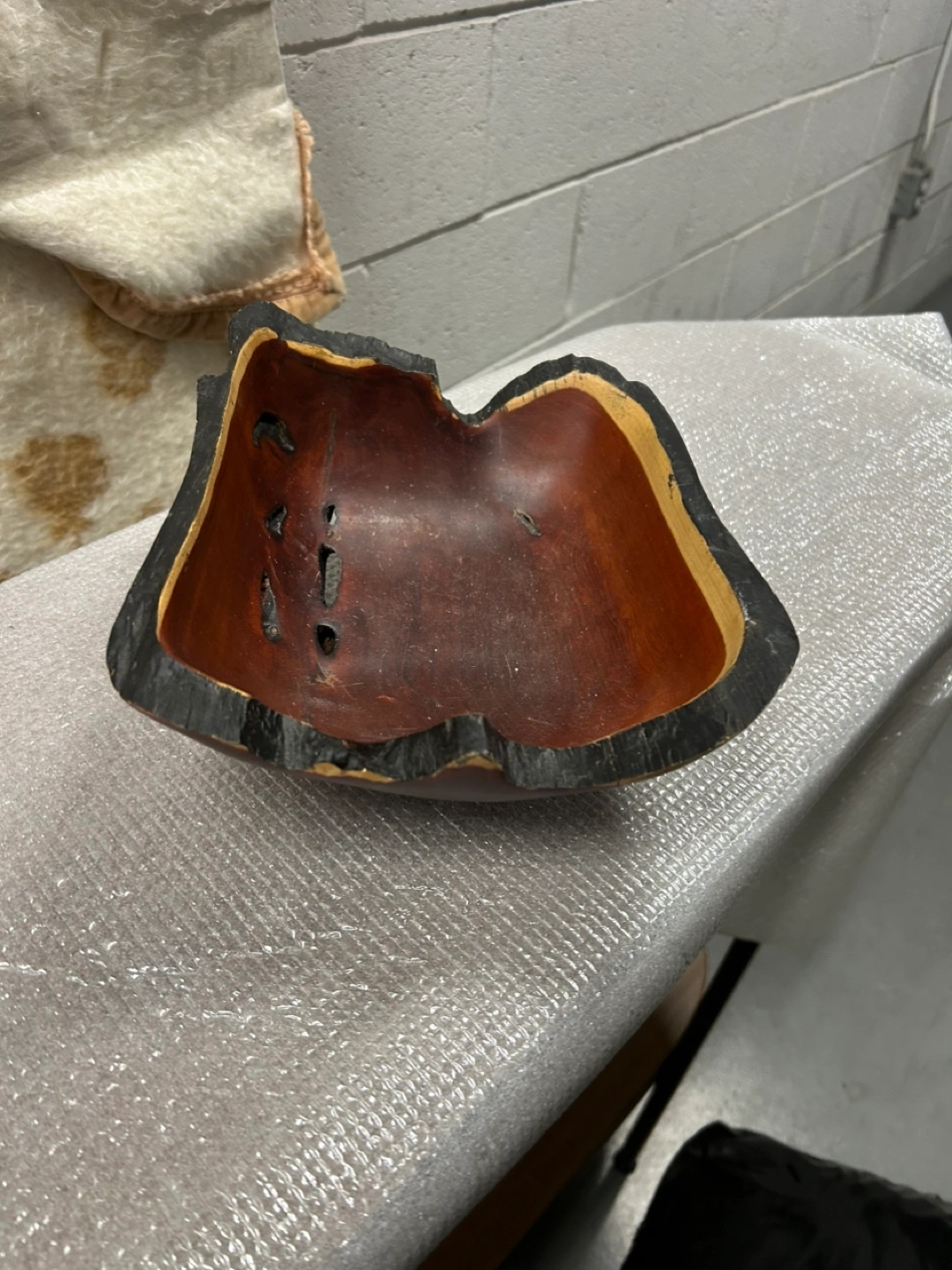 Unique handcrafted wooden bowl. Dark reddish-brown wood. Irregular shape. Charred edges. Small holes along the sides. Great for rustic decor.