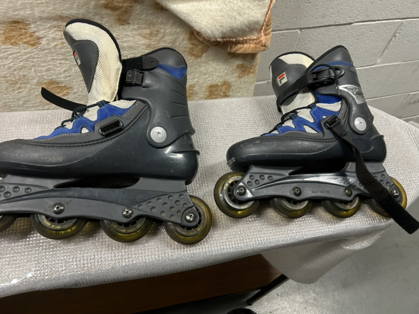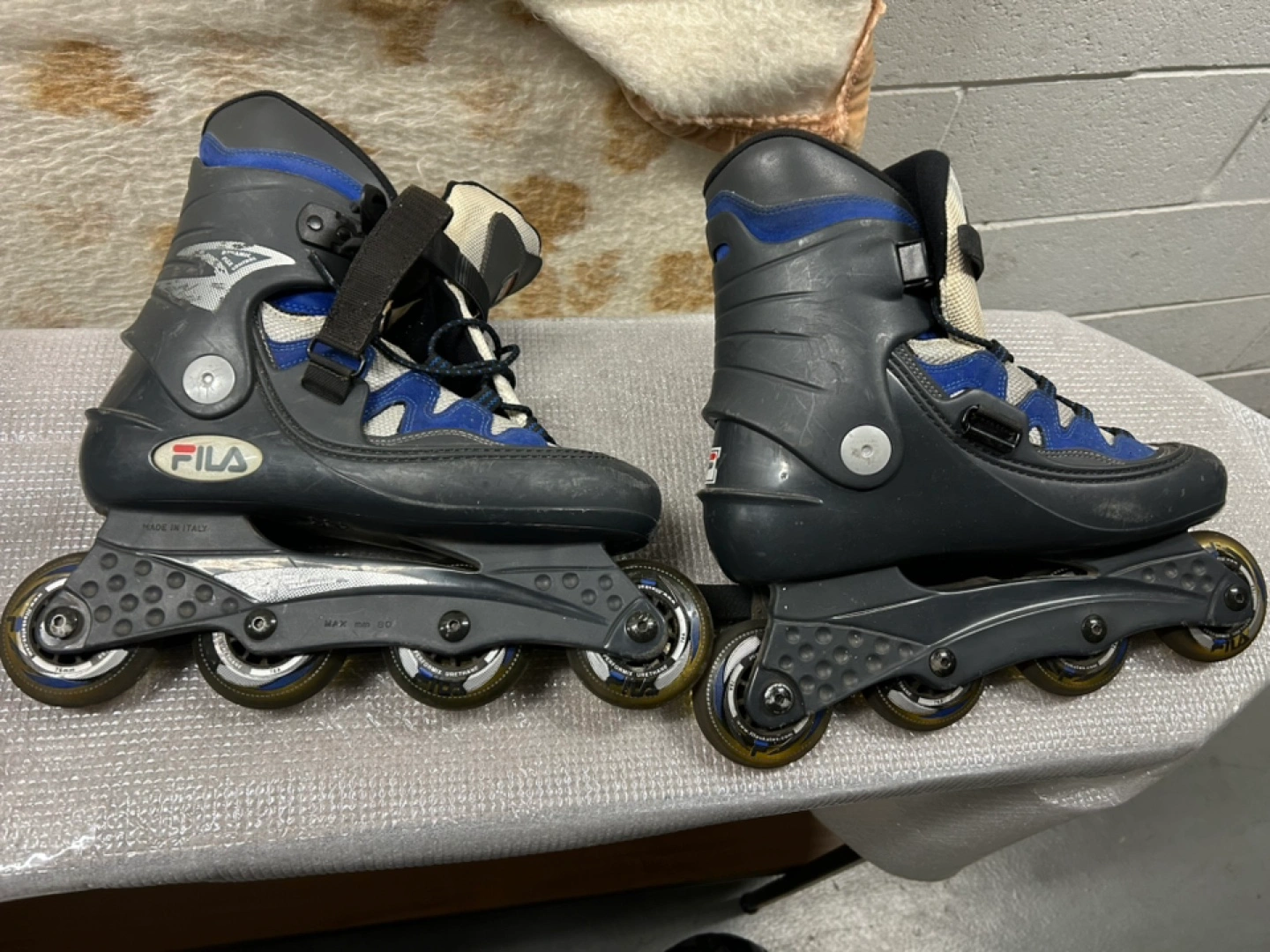 Pair of used Fila inline skates. Black, blue, and white colour scheme. Made in Italy. Four wheels per skate. Adjustable straps. Size 9.5 USA