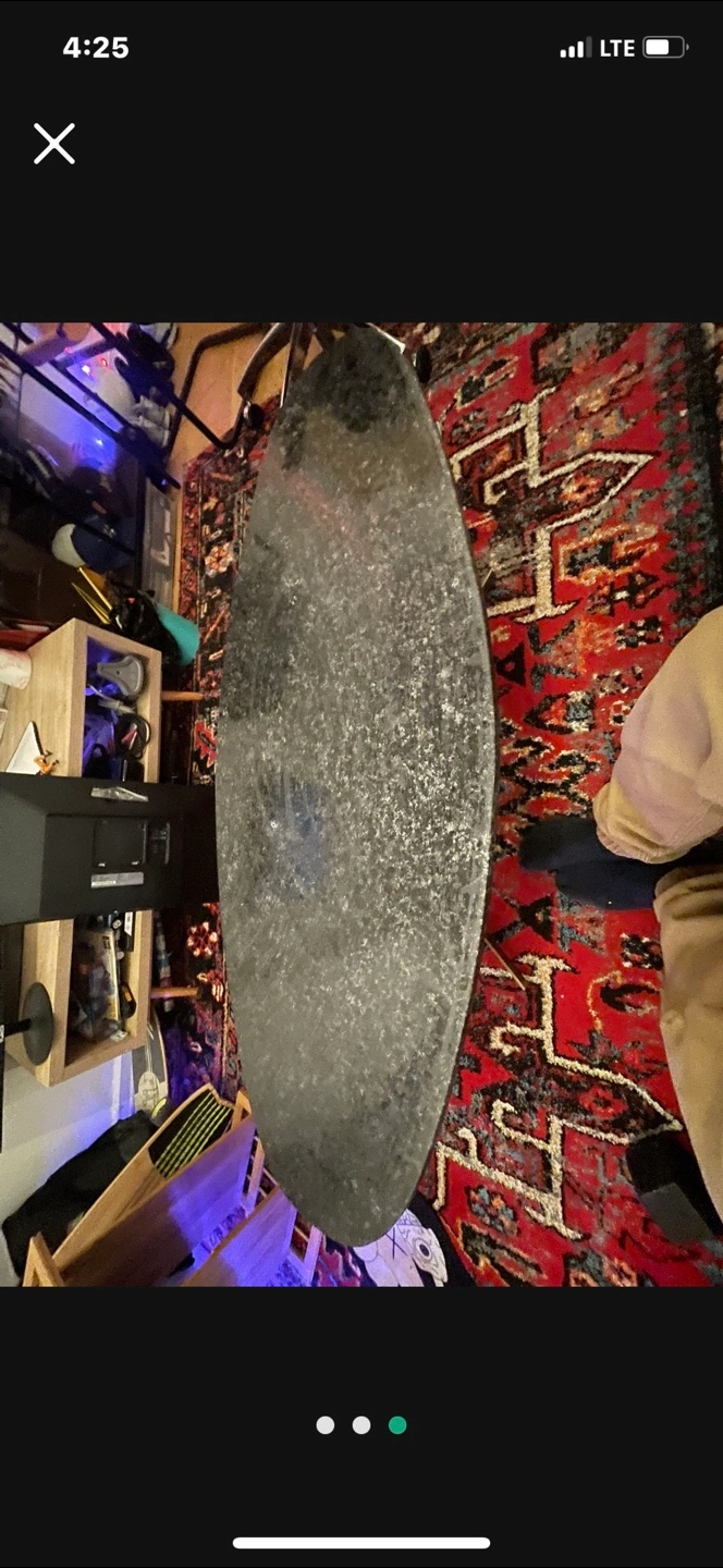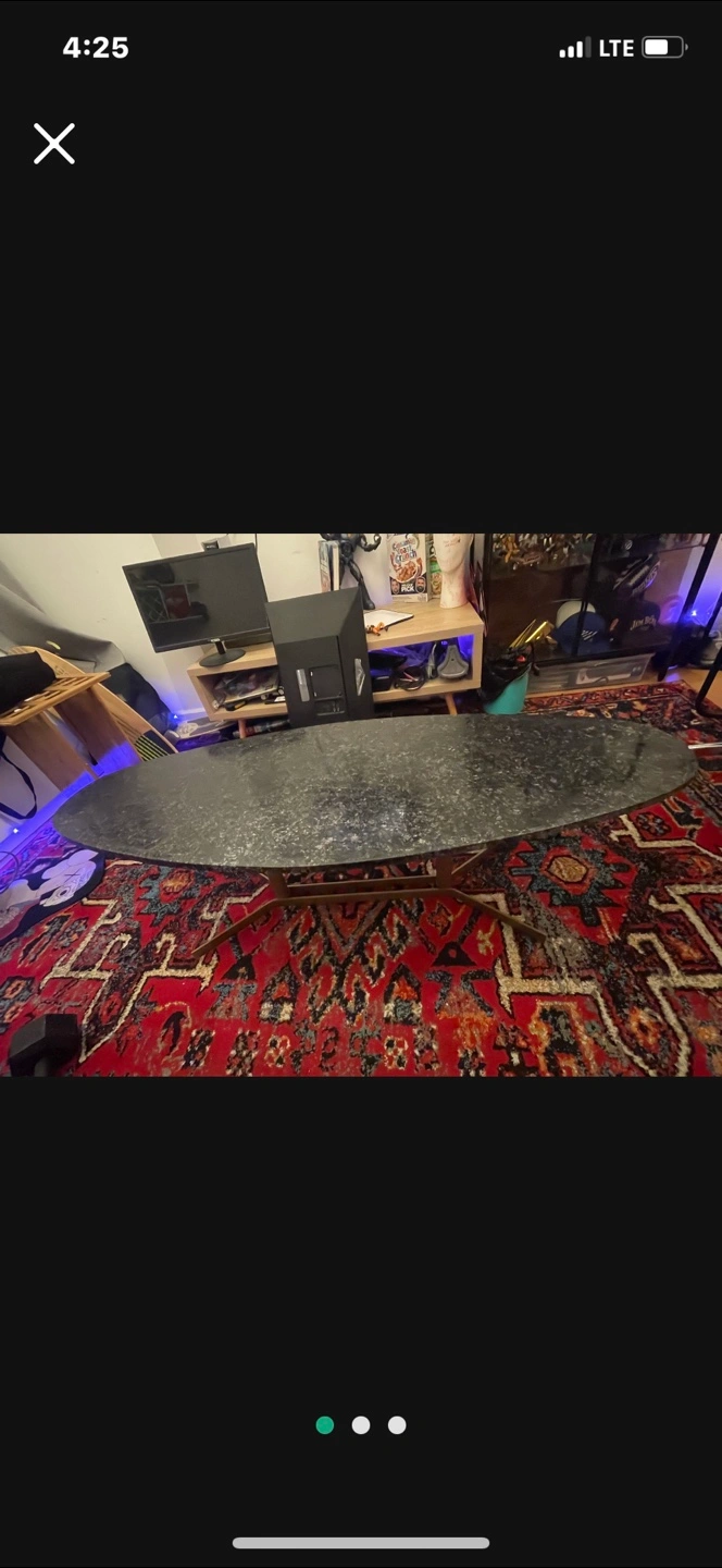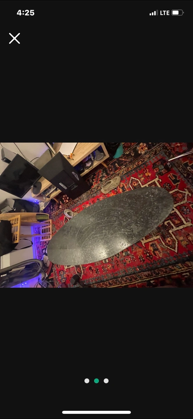 Unique oval coffee table. Natural rocky quartzite top. Modern wood legs. $200