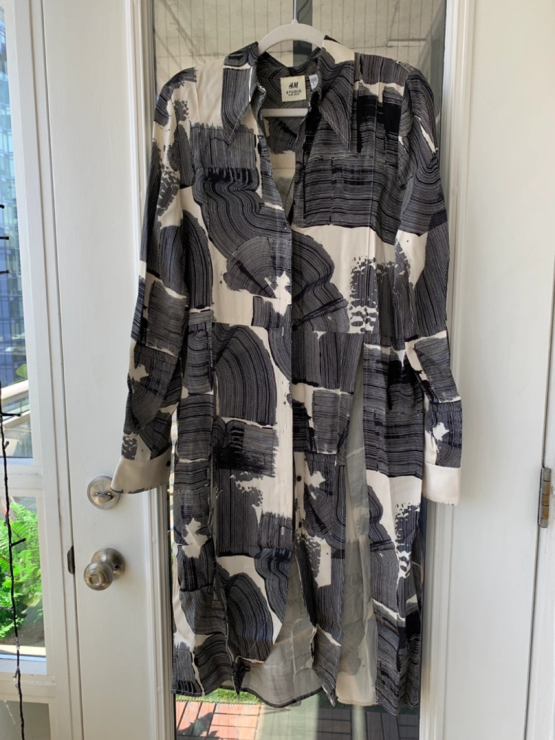 Long-sleeved shirt dress. Button-down closure. Black and white abstract print. Midi length. Side slits. Size 6, fits like a medium.