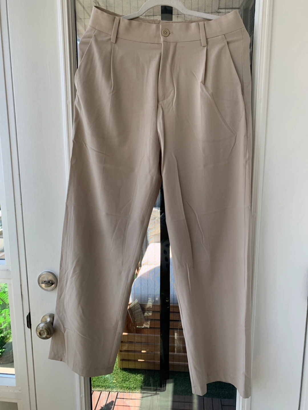 beige loose fit trousers. Size 28 mens, I’m a ladies 8 and these are just slightly too small for me now. High-waisted with pockets.