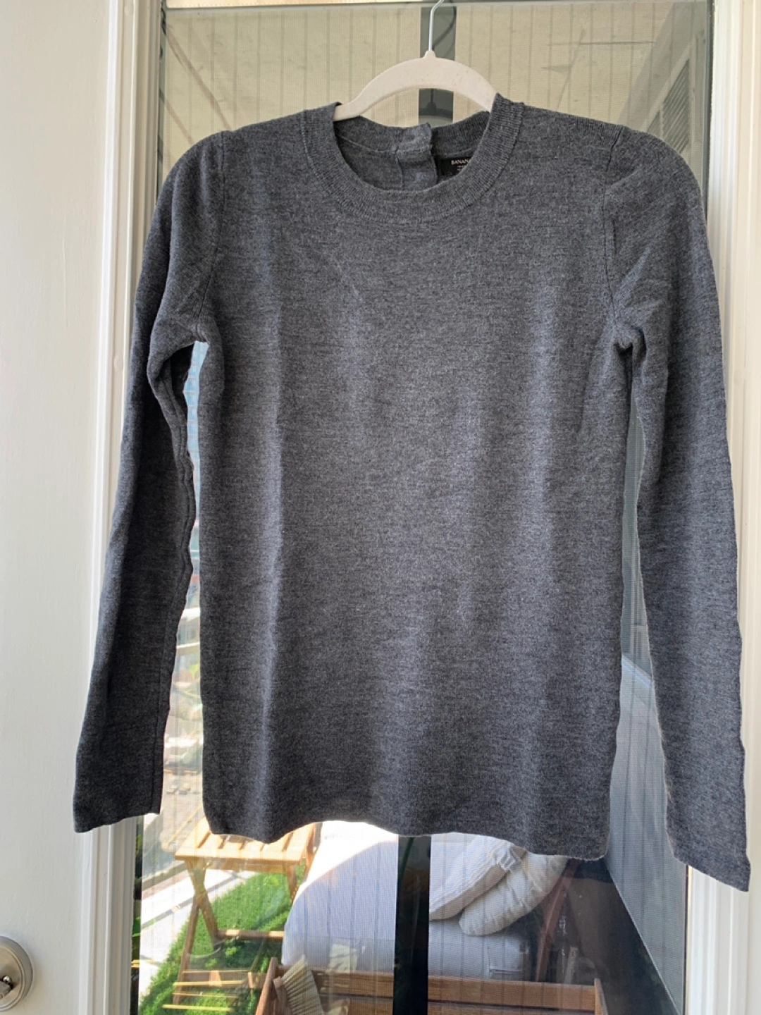 Grey long-sleeve sweater. 100% merino wool. Medium but slightly shrunken. Button closure at back neck.