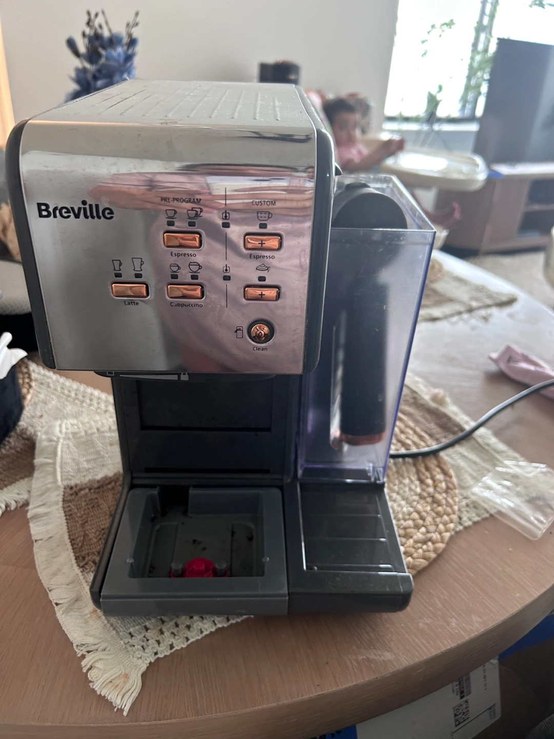 Automatic espresso machine. Makes espresso, latte, cappuccino. Pre-programmed and custom settings. Water reservoir.