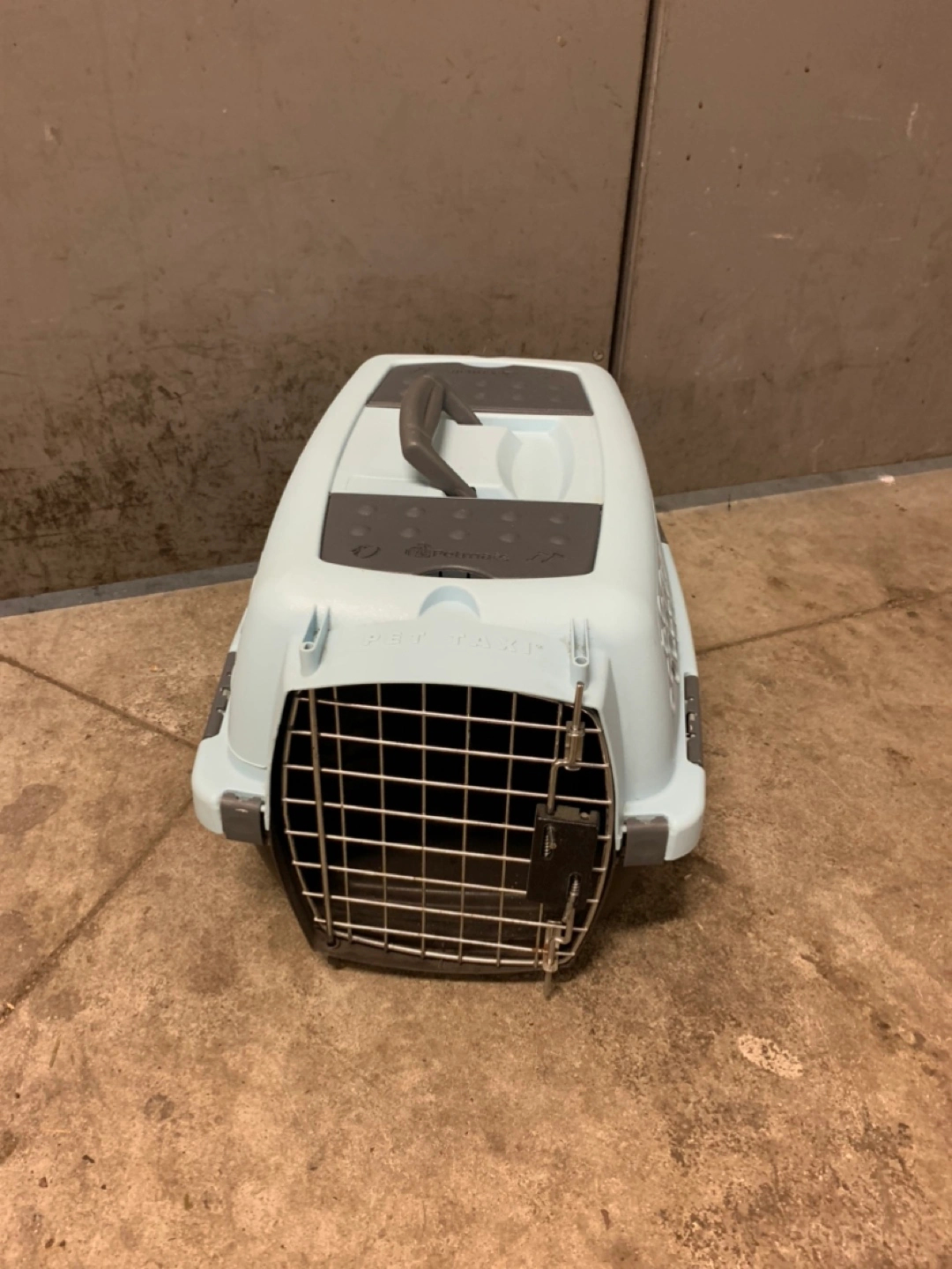 Pet Taxi pet carrier. Durable plastic construction. Grey and light blue. Features a wire door and carrying handle. Suitable for cats and small dogs.