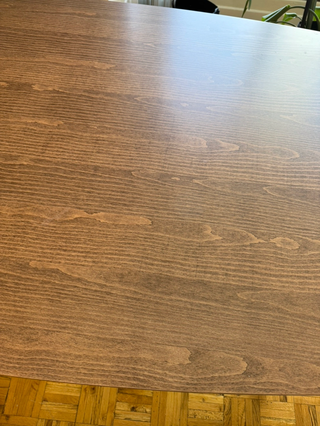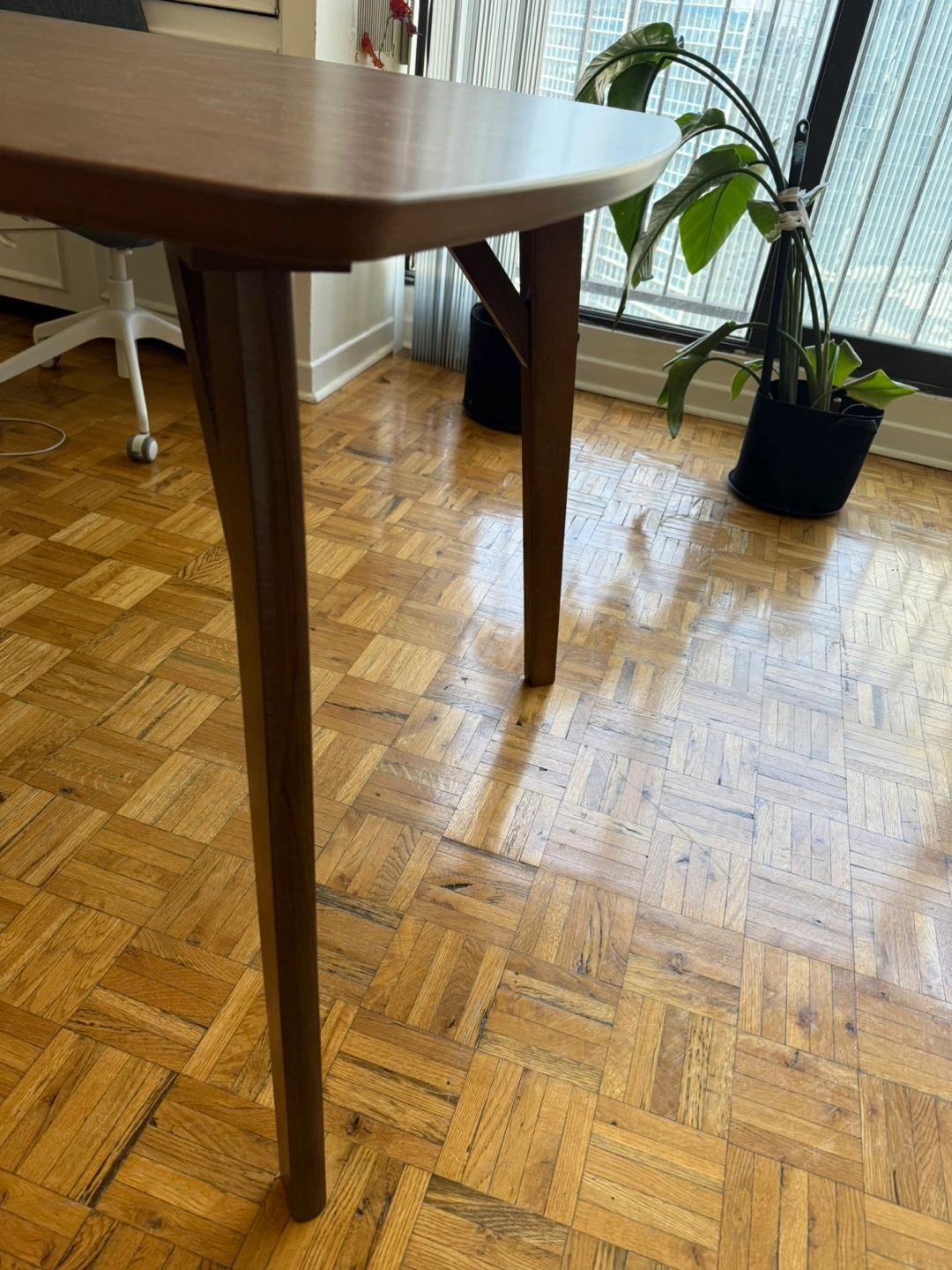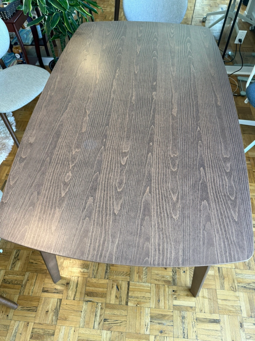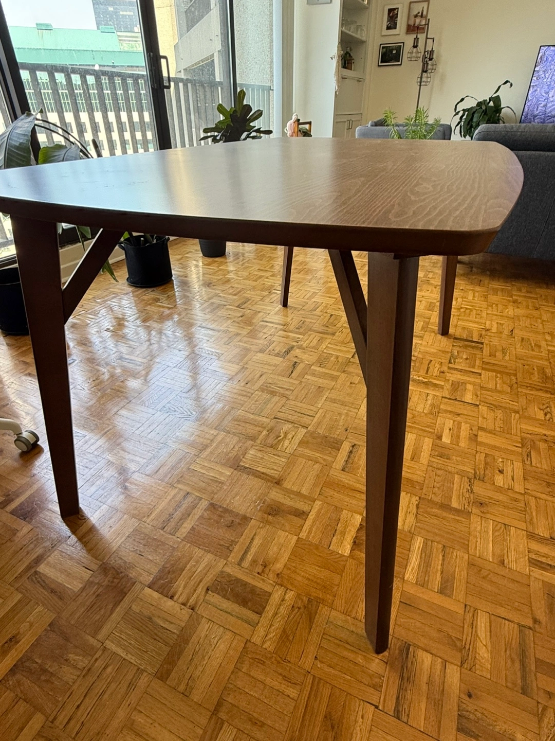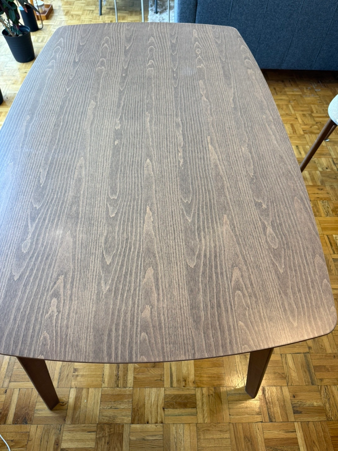 Dark brown wood grain finish. Slightly rounded rectangular table top. Four tapered legs.