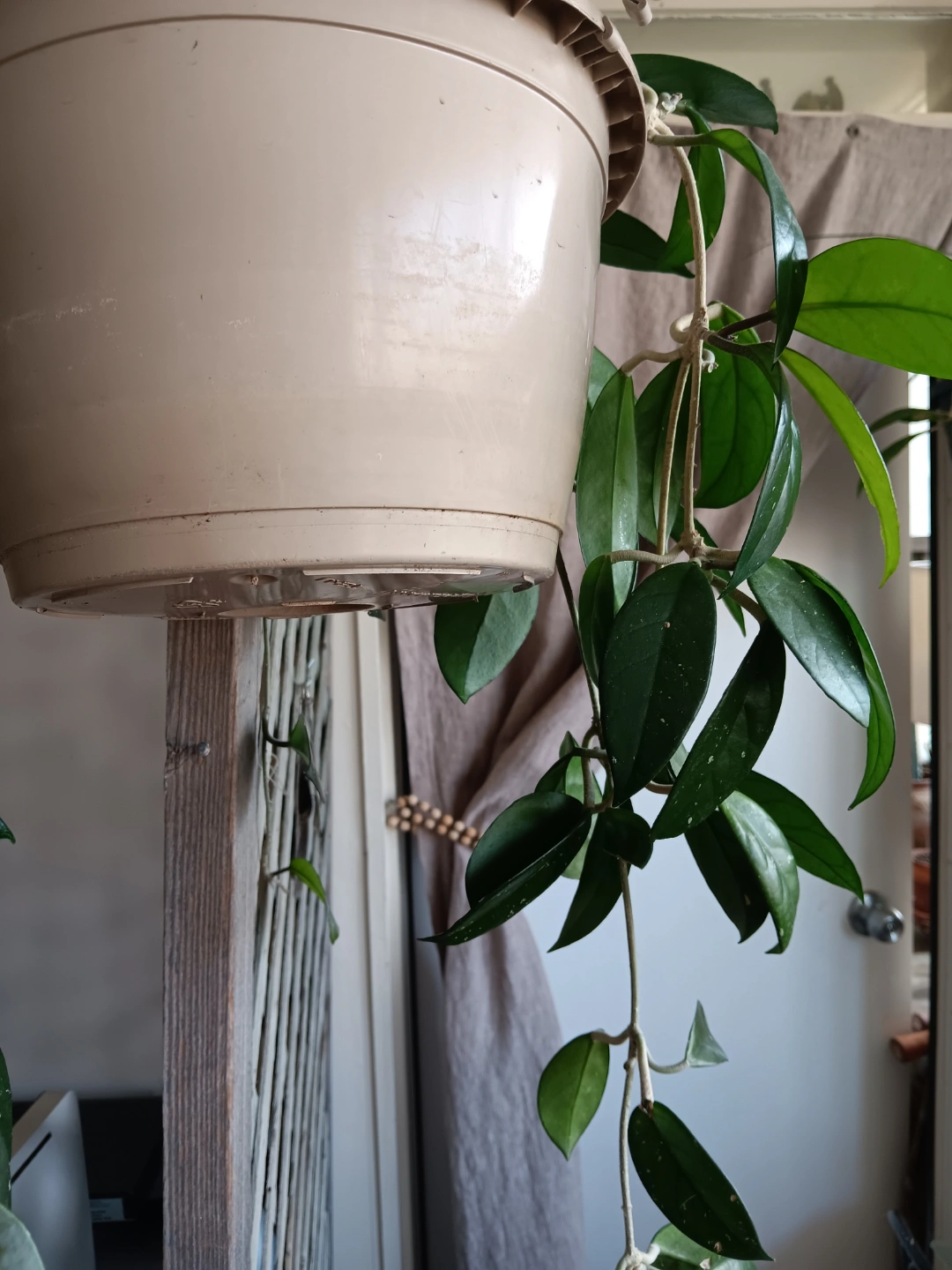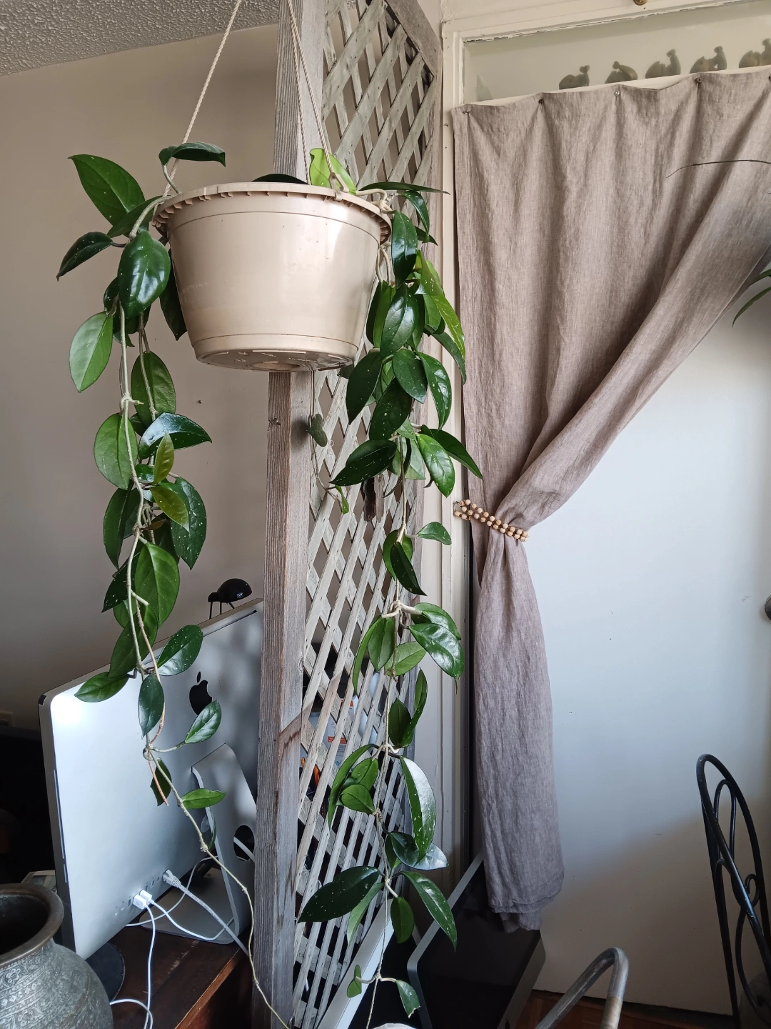 Healthy Hoya Carnosa in a beige plastic pot. Long vines, some new growth. Great addition to any home.