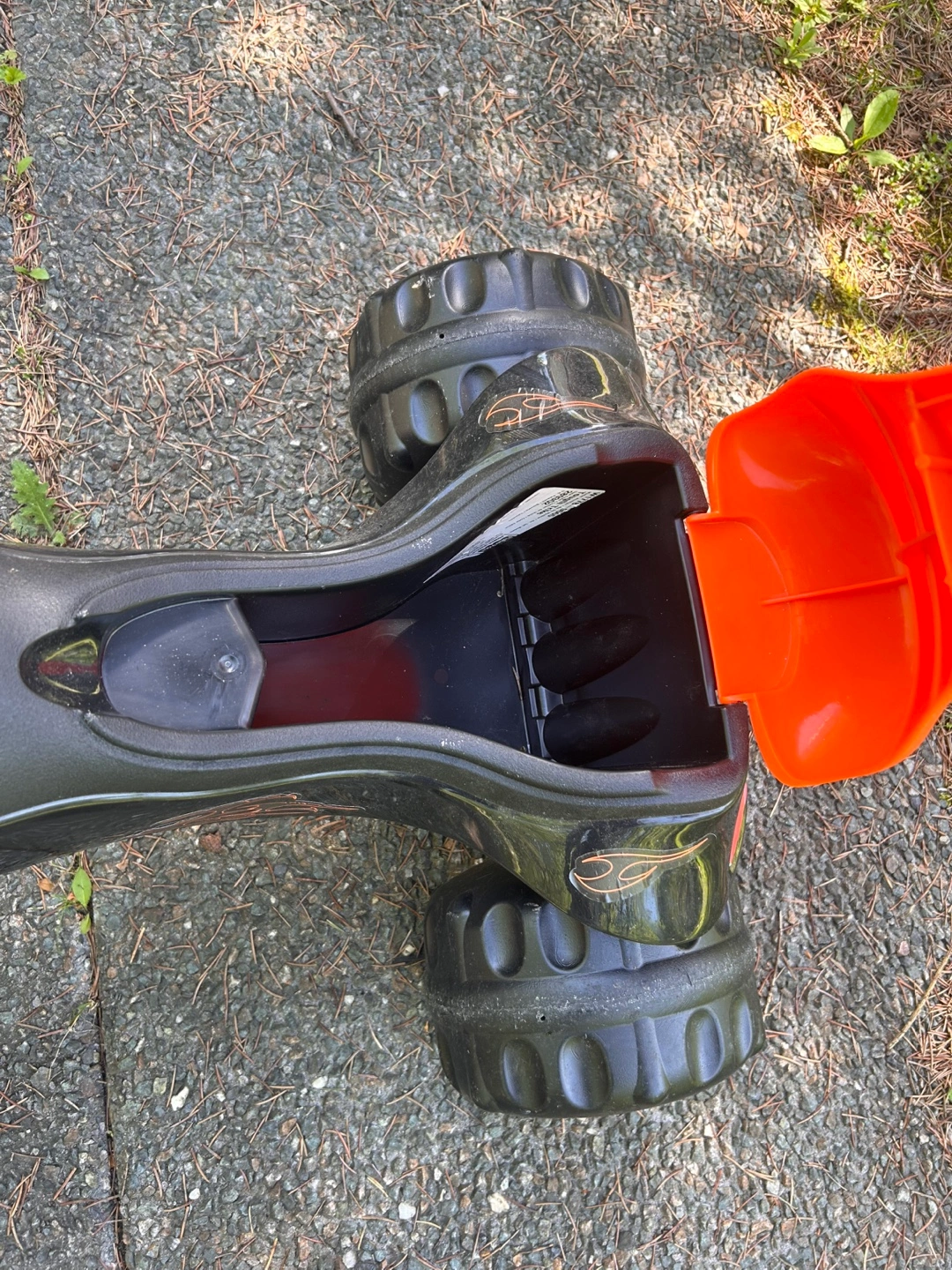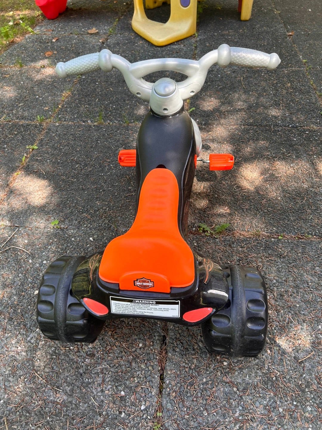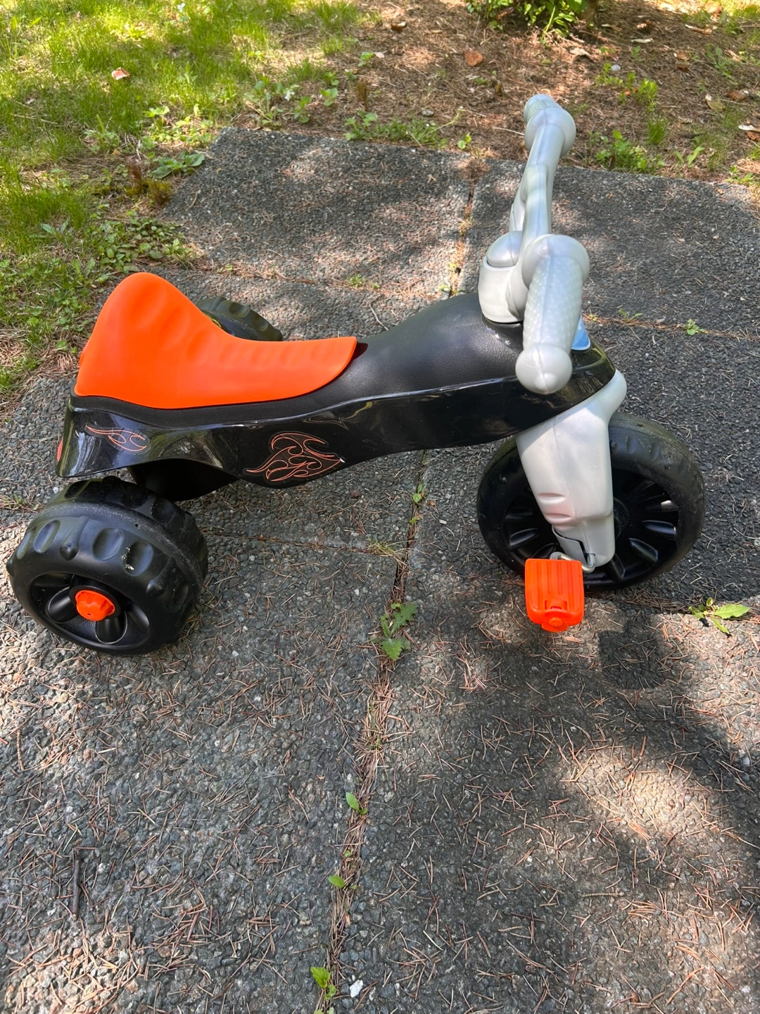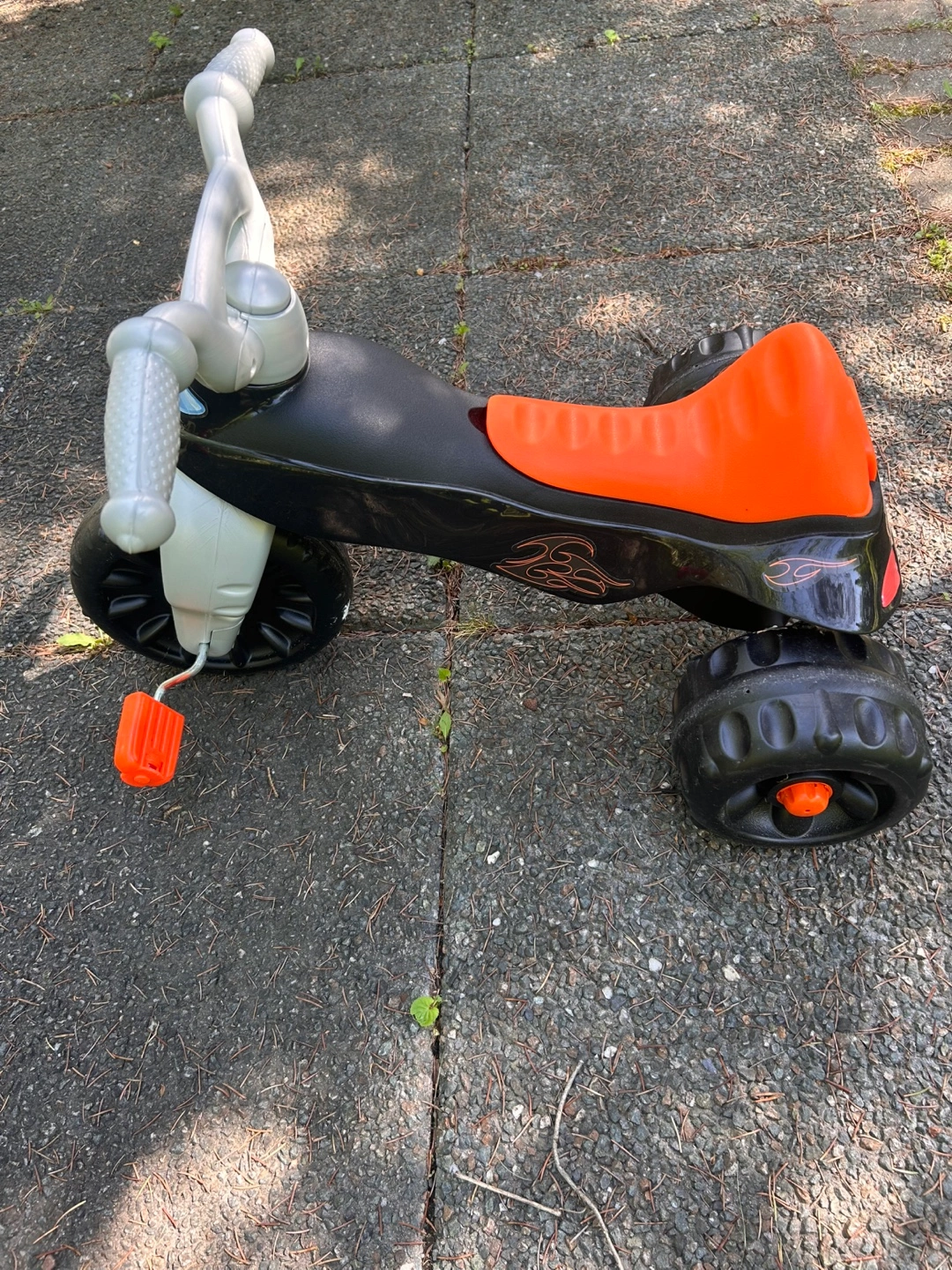Pre-owned tricycle. Black and orange. Features large wheels and a storage compartment. Suitable for toddlers.