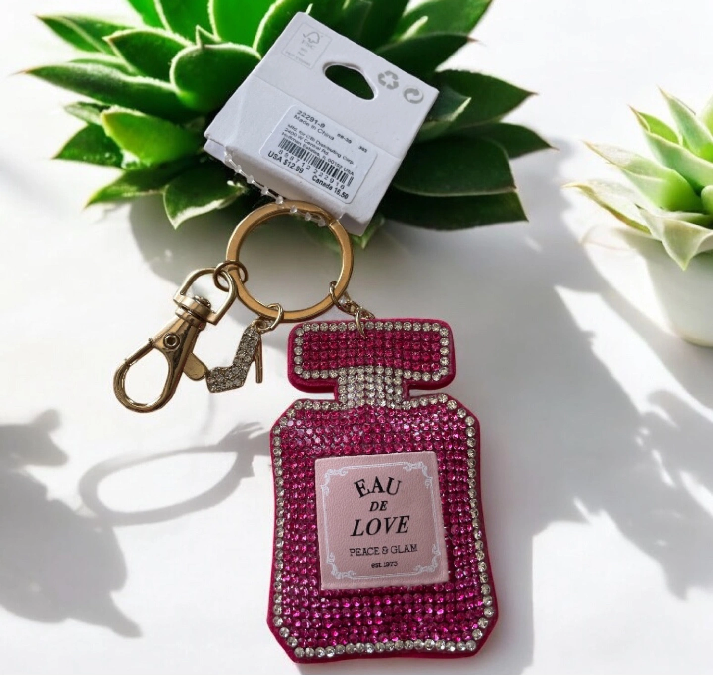 Pink perfume bottle keychain. Gold-toned metal. Rhinestone accents. Includes small shoe charm.