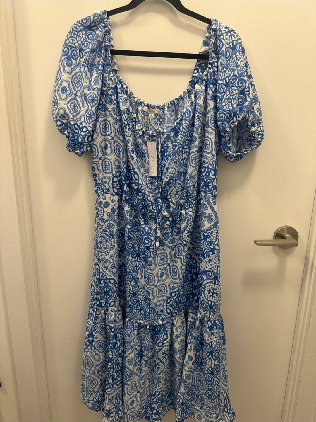 267*Brand New* Beautiful Parker & Rowe dress, Blue and white pattern. Off-the-shoulder neckline with tie that can gather for scoop- style. Perfect for summer outings or events!! Tiered skirt. Size large. 100% polyester and has linen-like feel. Tags still attached. Machine washable Smoke free/pet free home.