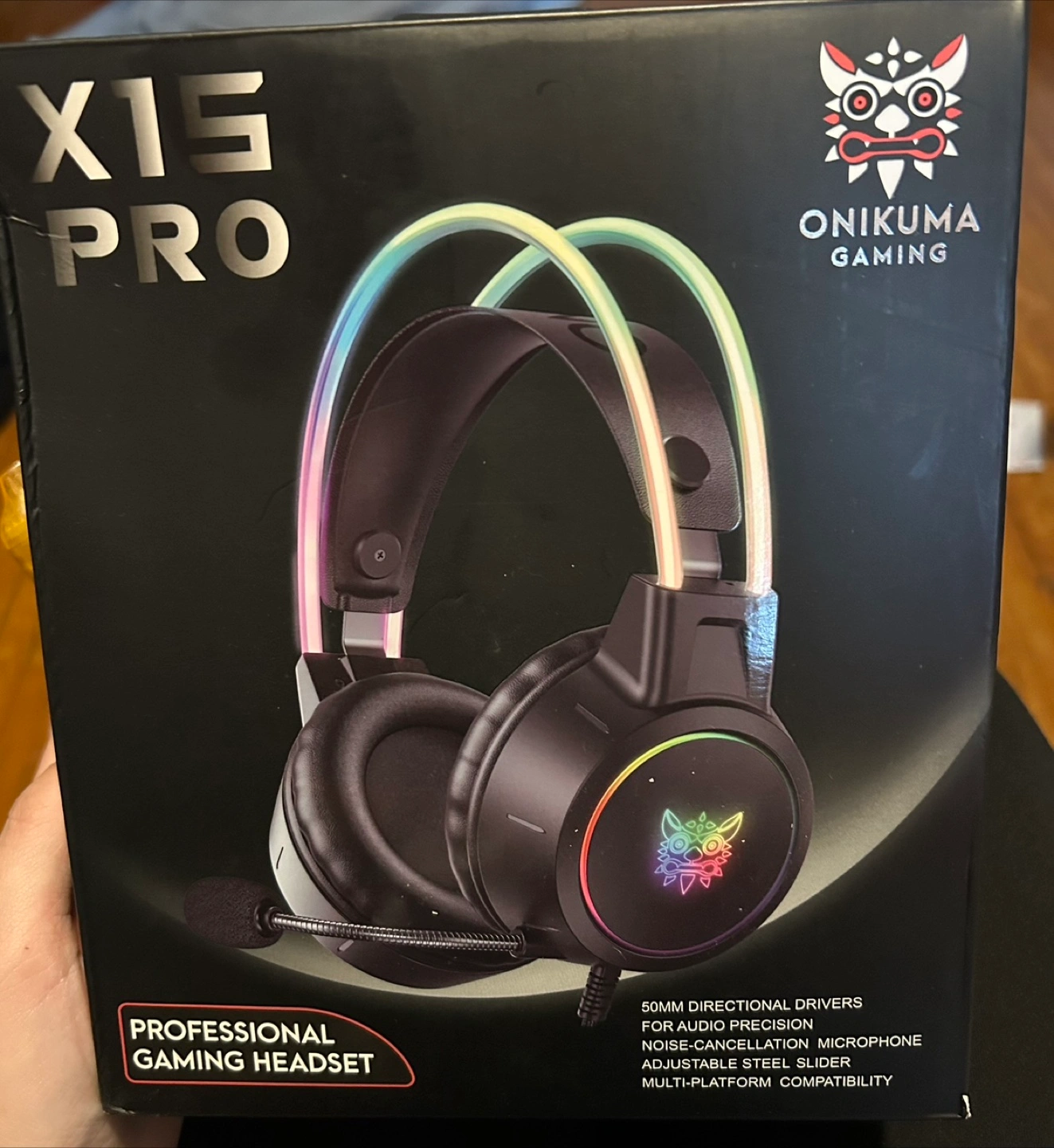 New ONIKUMA X15 PRO gaming headset. Features RGB lighting, noise-cancelling microphone, and comfortable padded headband. Multi-platform compatible. 50mm directional drivers for audio precision. Includes USB and 3.5mm connection.