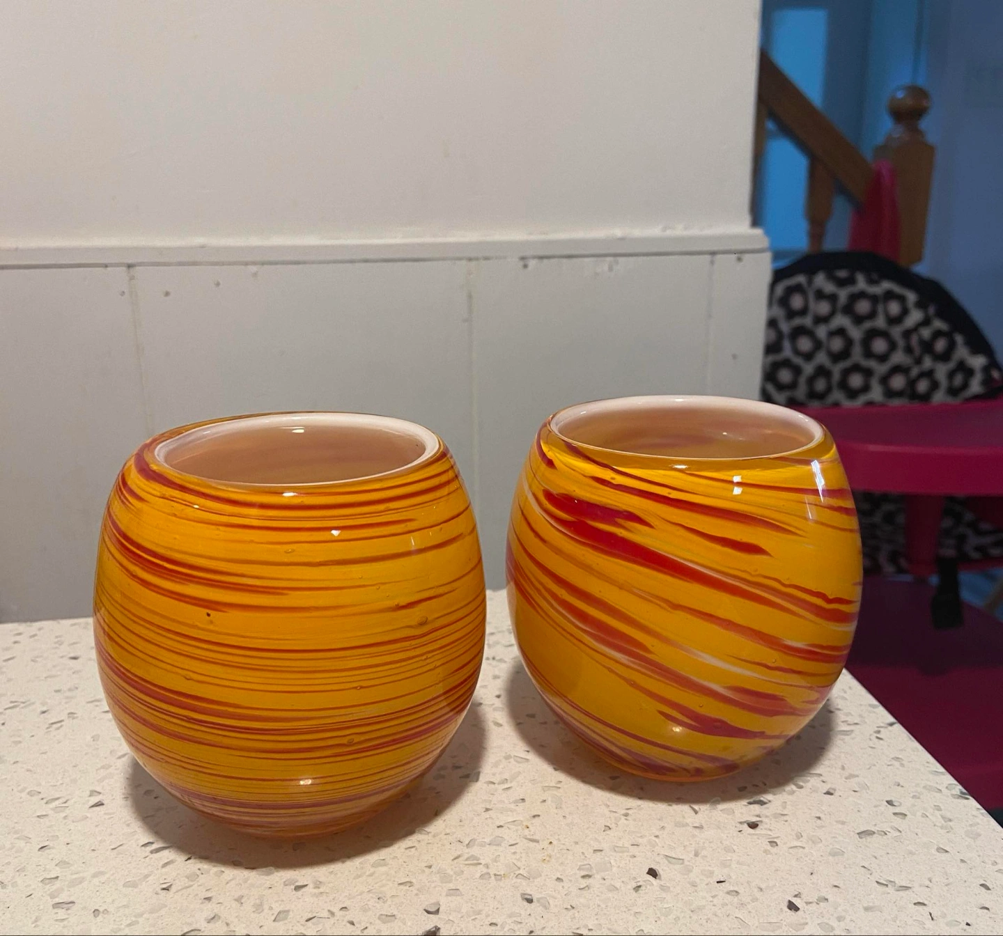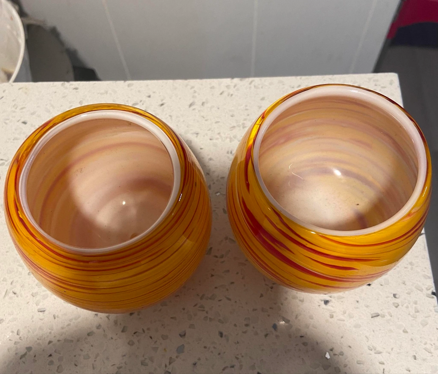 Set of two small decorative glass bowls. Yellow base with red and white swirl pattern. Unique design, perfect for home decor or small plants or candle holders.