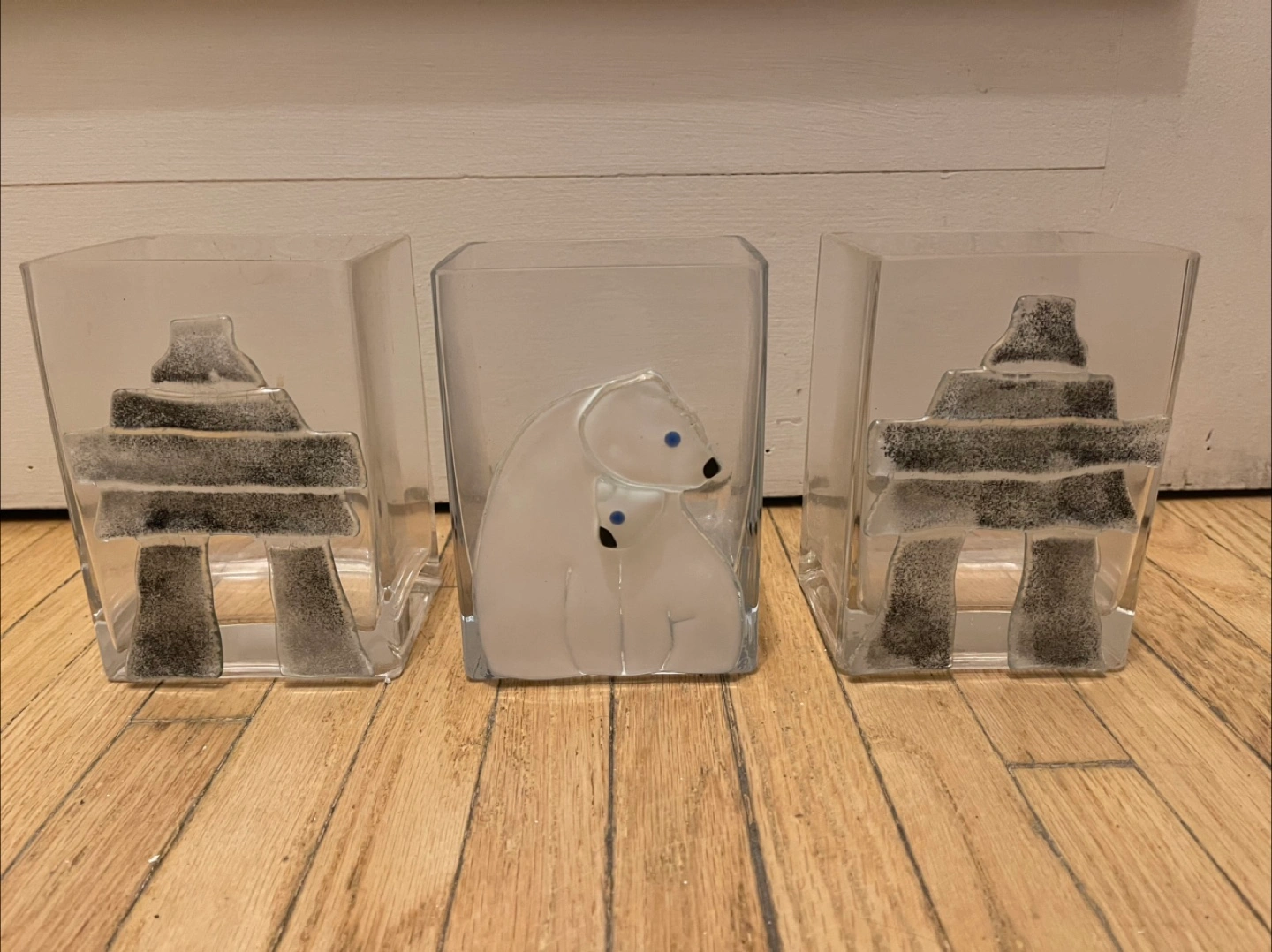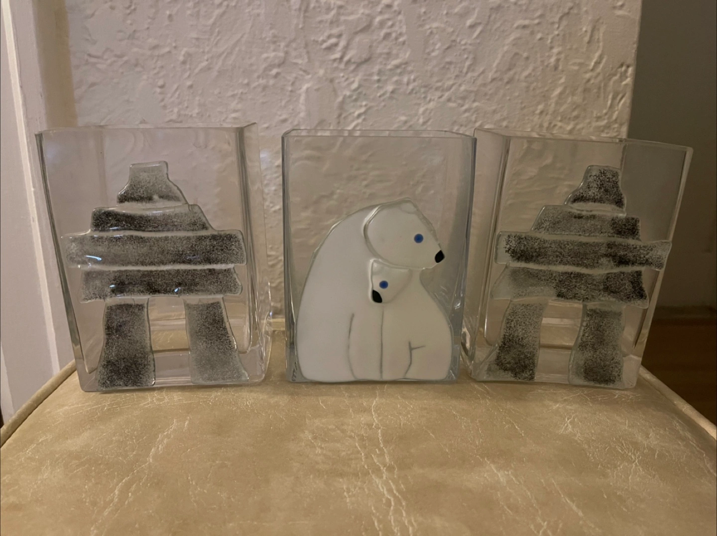 Set of 3 Fusion Art glass vases featuring bears and inukshuks