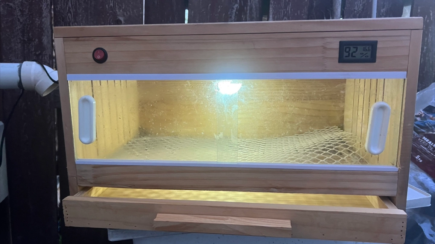 337Small wooden enclosure. Features a light, digital hygrometer, and pull-out drawer. Suitable for reptiles or amphibians. Some minor wear. L50 x W30 x H30 cm