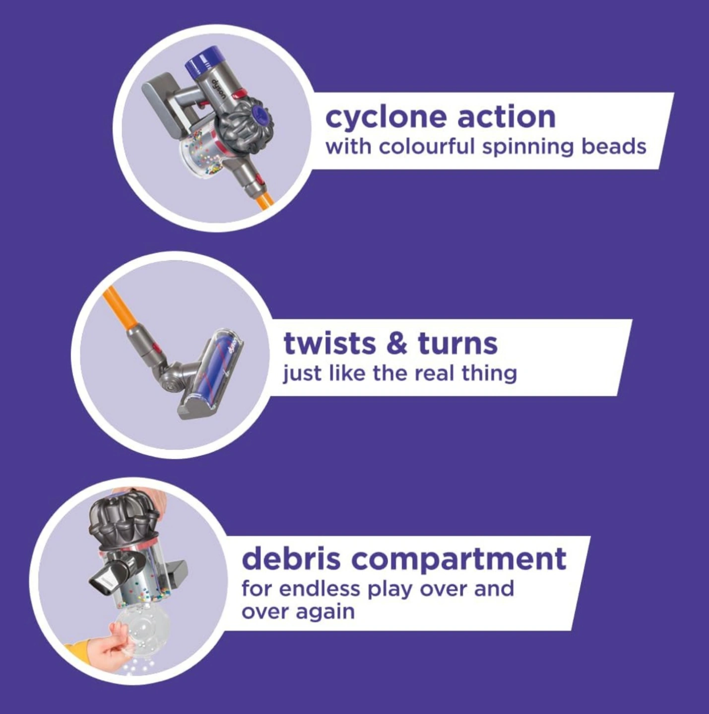 BNIB Explore endless imaginative play while developing coordination, sparking creativity, and enhancing core motor skills in every delightful sweep. Either use the short nozzle for handheld vacuuming or the long handle for ‘twist & turn’ cleaning. Officially licensed, this toy vacuum cleaner has been designed to look just like the famous Dyson Cordless vacuum for realistic role-play fun! Officially licensed toy Dyson Cordless vacuum with accessible debris tray, simulated cyclone action, easy to release attachments, and a long and short nozzle. Weight (kg): 0.64, Length (cm): 23.5, Width (cm): 10.0, Height (cm): 14.5 / 71 upright Recommended age: 3+ Requires adult supervision Requires 3 AA batteries FINAL SALE Accepting cash only please